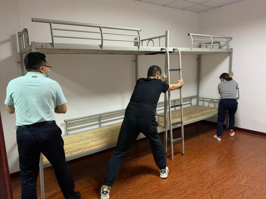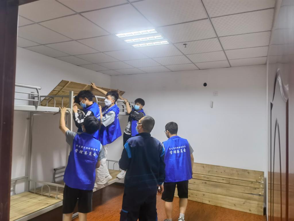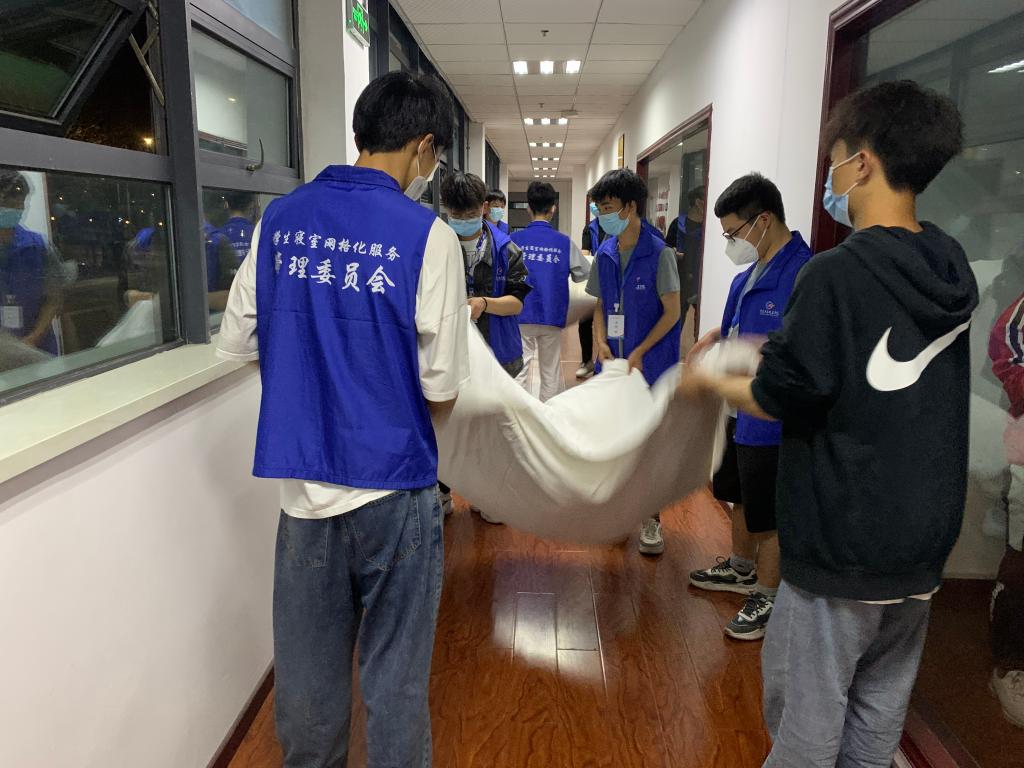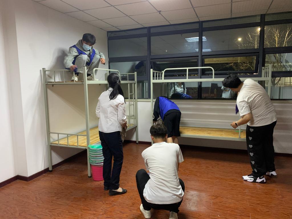3月12日凌晨,后勤处、学工部、学生宿舍网管会师生在合川校区桔园北楼紧急布置临时健康管理区
