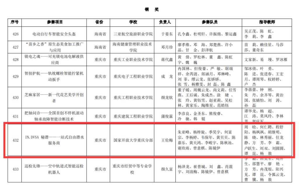 【供稿/远程教育中心】日前,教育部印发了《教育部关于公布第七届中国国际“互联网+”大学生创新创业大赛获奖名单的通知》,我校《IN.DVSA 秘潜——一站式自由潜水服务商》项目荣获全国总决赛职教赛道铜奖,《Y’小面——全球独创小面智能生产加工设备供应商》项目入围总决赛。