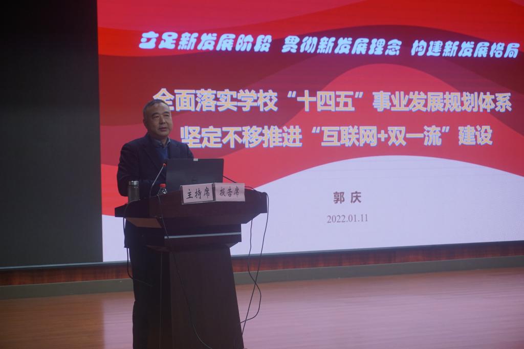 郭庆书记强调,全校各单位(部门)要系统做好学校总体规划、专项规划、行动计划的解读、宣传、贯彻、细化、分解、执行、评估、调整、考核等工作,聚焦立德树人根本任务,全面落实中央重大教育改革战略部署;聚焦经济社会重大需求,全面加强服务地方经济社会发展能力;聚焦关键领域重大改革,全面推进学校治理体系和能力现代化;聚焦学习方式变革创新,全面深化信息技术教育教学融合发展;聚焦安全发展总体要求,全面强化校园风险防范管理体系建设,为学校高质量发展提供强大动力和坚强保障。