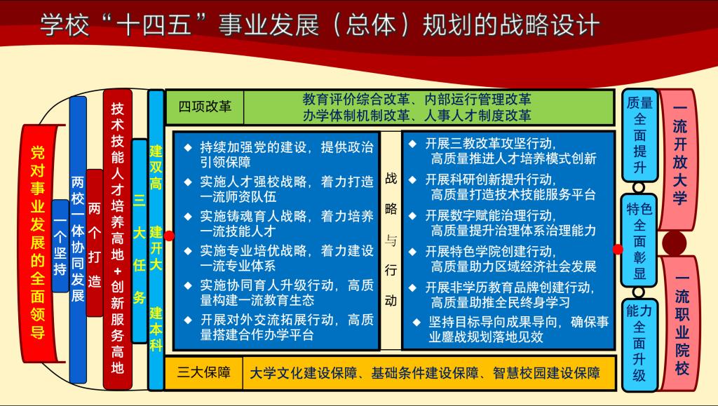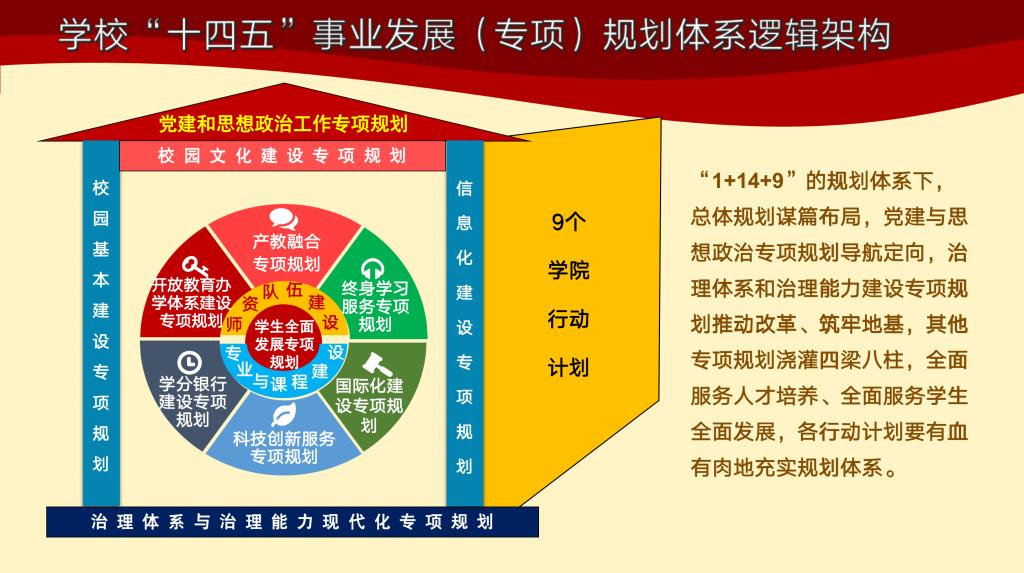 为确保“十四五”事业发展规划落细落地,学校构建了“1个总规+14个专项规划+9个二级学院行动计划”的规划体系,高质量打造事业发展目标链、标准链。“十四五”期间,我校将按照高质量发展工作布局,重点推进党建和思想政治工作、师资队伍建设、专业与课程建设、学生全面发展、校园文化建设、校园基本建设、治理体系与治理能力建设、信息化建设、产教融合、开放教育办学体系建设、终身学习服务、国际化建设、科技创新服务、学分银行建设等14个专项规划,全力实施9个二级学院行动计划,以学校“十四五”期间主要发展指标任务为抓手,推动“互联网+”办学特色鲜明的新型大学建设进入发展快车道。