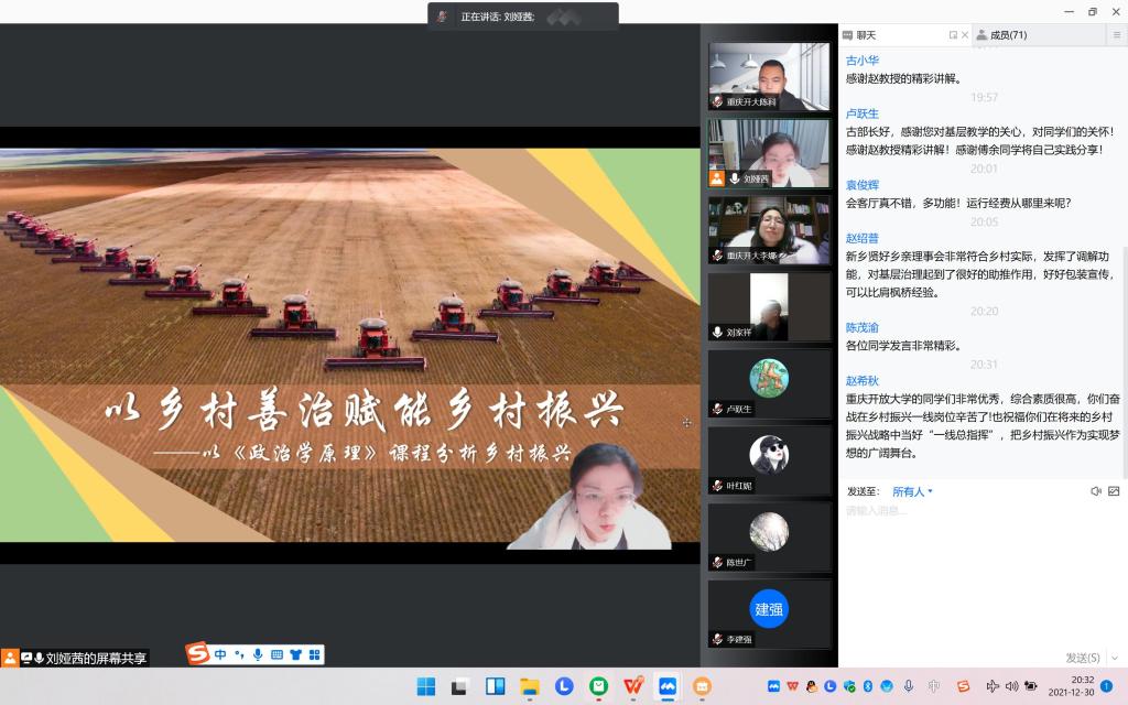 活动中,国家开放大学《政治学原理》课程网络核心团队成员、青岛开放大学赵希秋教授从宏观层面分析了我国乡村振兴战略提出的背景。来自铜梁工作站、石柱电大、丰都工作站从事基层乡村振兴工作的行政管理专业学生,结合专业基础理论知识,分享了乡村振兴的基层实践。部分教学团队负责人从专业课程角度分析和解读了我国乡村振兴政策和实践。古小华部长从教学改革、课程思政、课程实践等方面对本次课程实践活动进行了点评,并给予了充分的肯定。