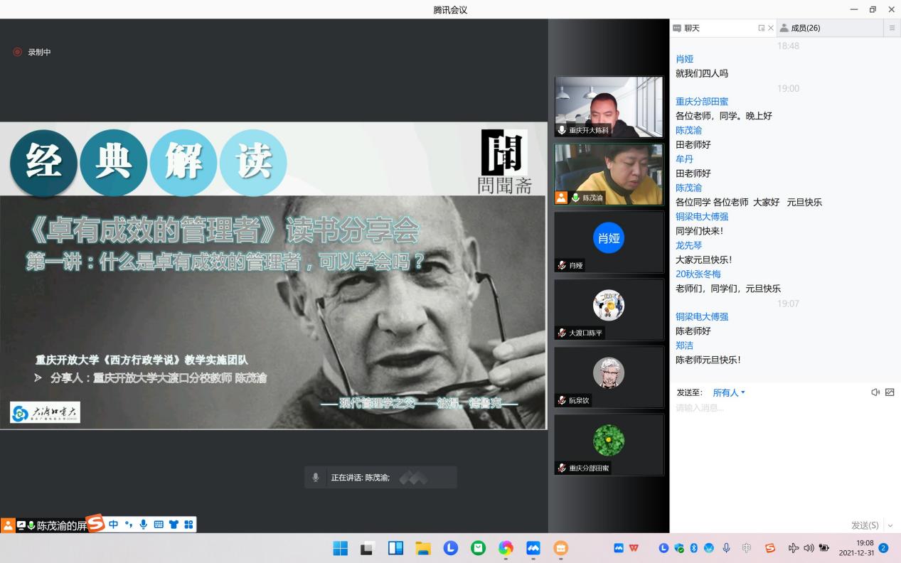 读书分享会上,来自大渡口分校的陈茂渝老师结合自身对现代管理学之父彼得·德鲁克所著《卓有成效的管理者》一书的精心研读心得,就“什么是卓有成效”、“为什么提出卓有成效”、“管理者为什么卓有成效”等3个话题进行了分享,为同学们带来一场跨年精神盛宴,深化了同学们对《西方行政学说》课程相关知识点的理解和把握。