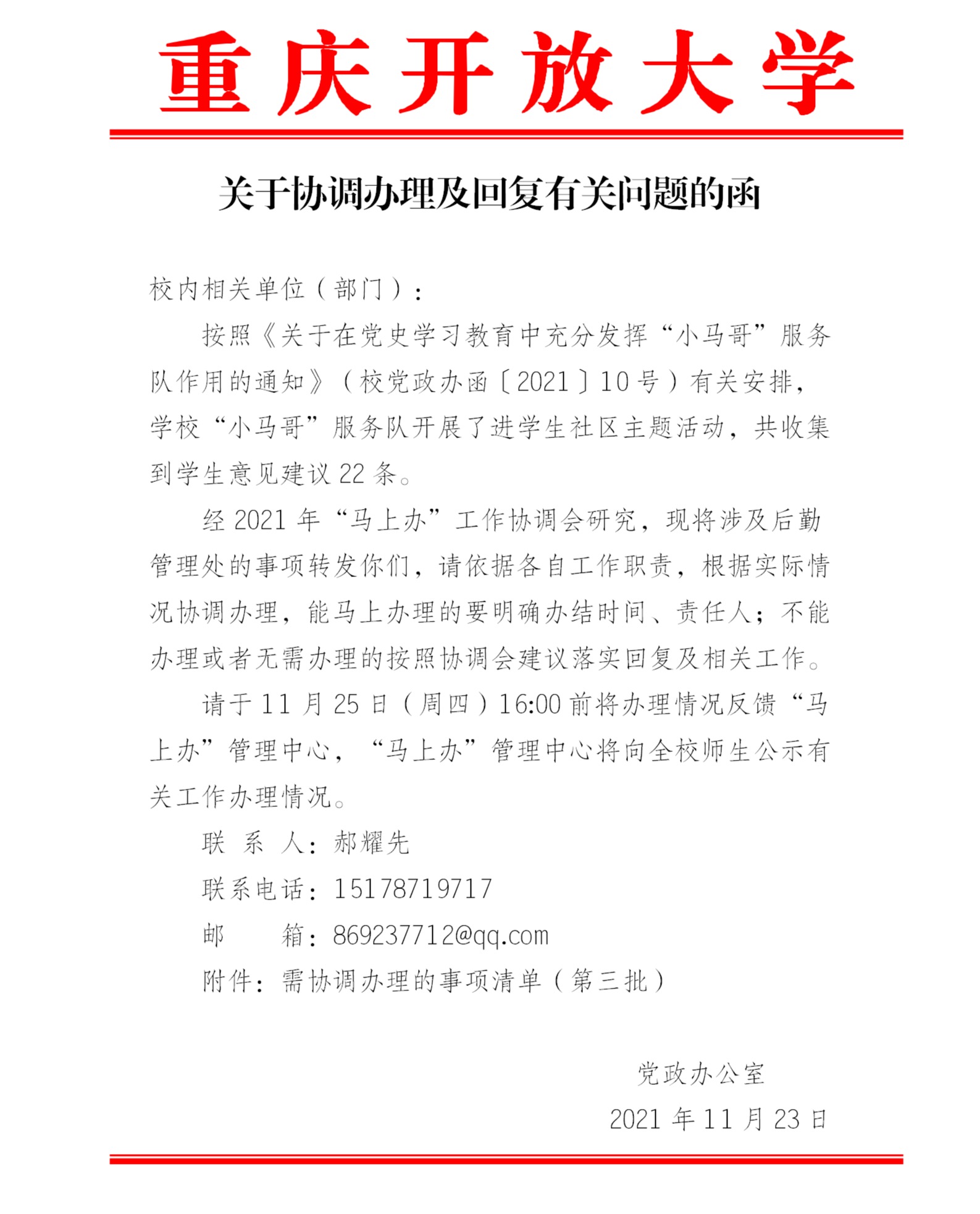 在流程再造和部门协同方面发挥好协调作用。重点针对需要跨部门解决的问题,积极协调相关单位(部门)联动处理,如针对“校园管控期间快递收取难的问题”,一面对接后勤管理处在场地、照明等方面加以保障,另一面对接党委保卫部在快递人员进校园方面强化管理;针对学生反映的“寝室隔音不佳”的问题,一面对接后勤管理处采购静音垫,从硬件上进行改良,另一面对接党委学工部安排社区辅导员上门交流,引导同学们主动降噪。