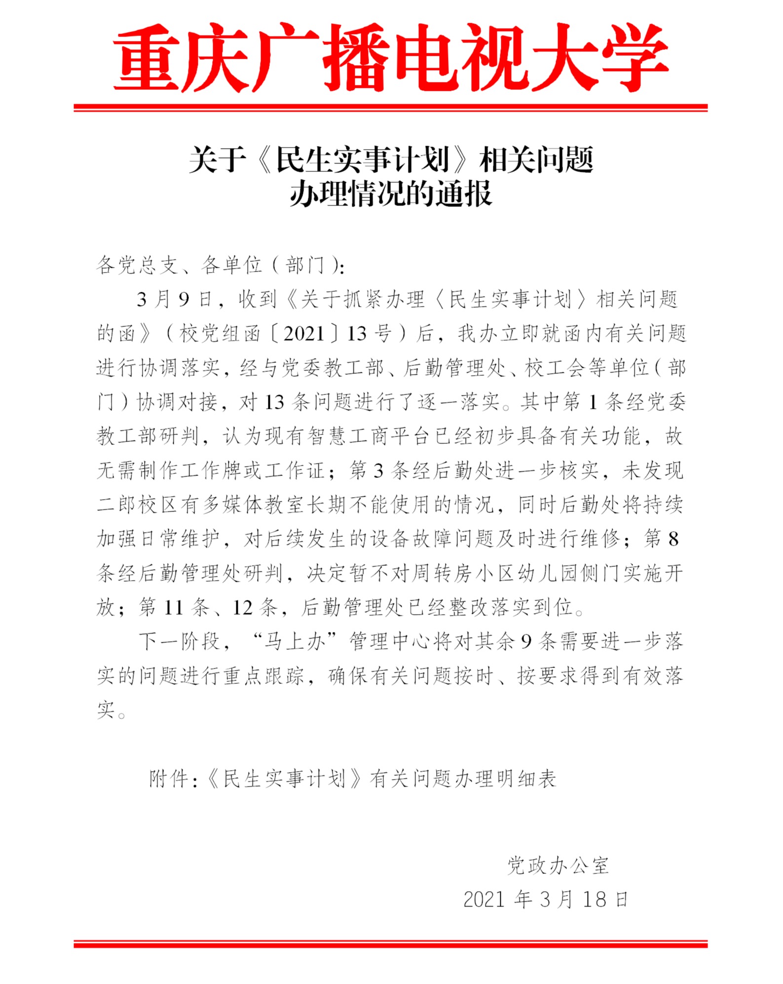 师生关注的“学院在学生入党工作中执行标准不统一”“图书馆占座”“学生社区配备烘干机”“快递收取”“教学楼区域电动车停车棚”“合川校区北门商贩占道影响通行”“开通网上缴纳电费系统”“实训室增设烧水器”“教学楼多媒体设备维修”等问题均已得到解决。
