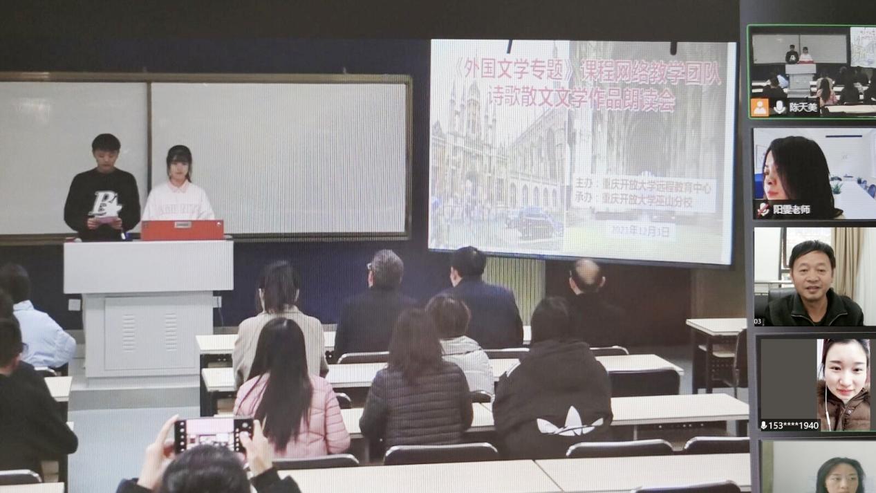 【供稿/陈天美 阳雯】12月3日,由我校远程教育中心主办,巫山分校承办的《外国文学专题》课程网络教学团队诗歌散文文学作品朗读会举行。活动中,10余位同学分享了《我是一条激流》《当你老了》《生活的邀请函》等不同年代的各类外国文学文学作品,通过朗读与现场点评,师生互动交流,激发文学阅读兴趣,感悟文学艺术真善美真谛。巫山分校汉语言文学专业学生及汉语言文学中心教研组成员参加了朗读会。