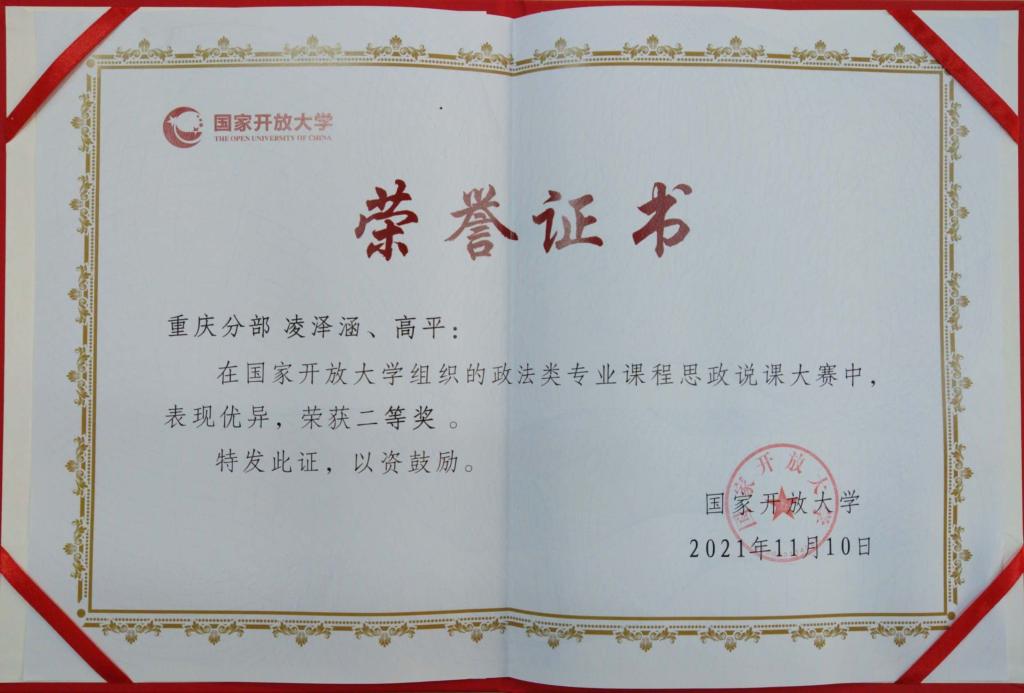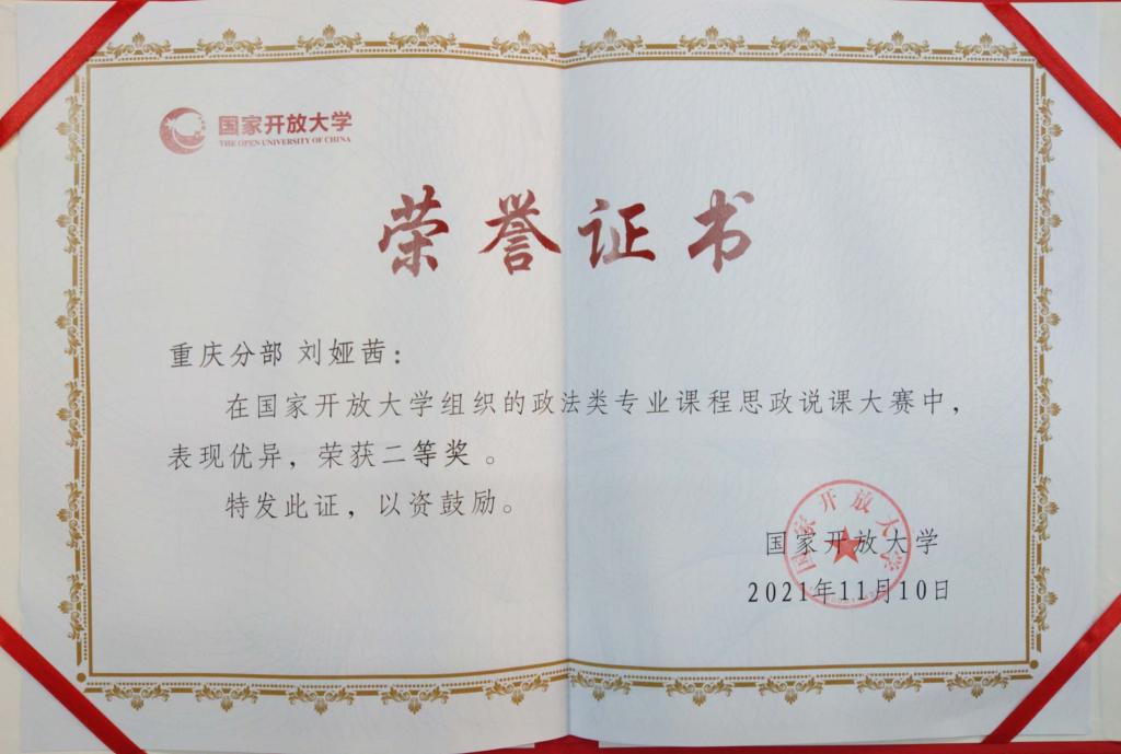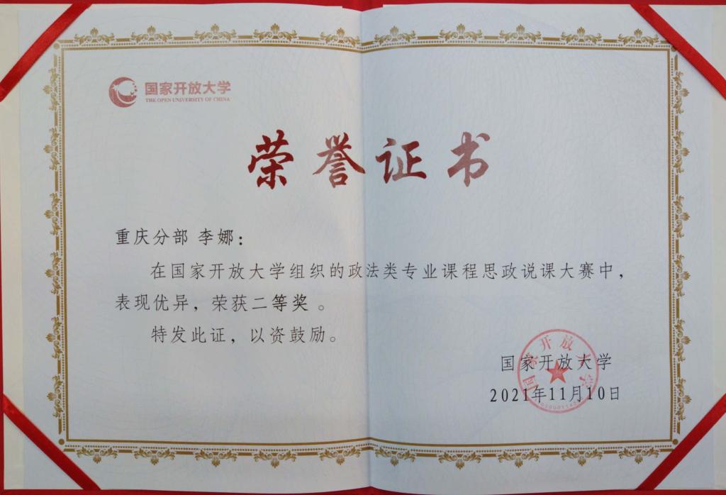 【供稿/远程教育中心】 2021年11月16日,国家开放大学政法类专业课程思政赛场再传好消息,我校教师在国家开放大学政法类专业课程思政说课大赛中,荣获二等奖3项。