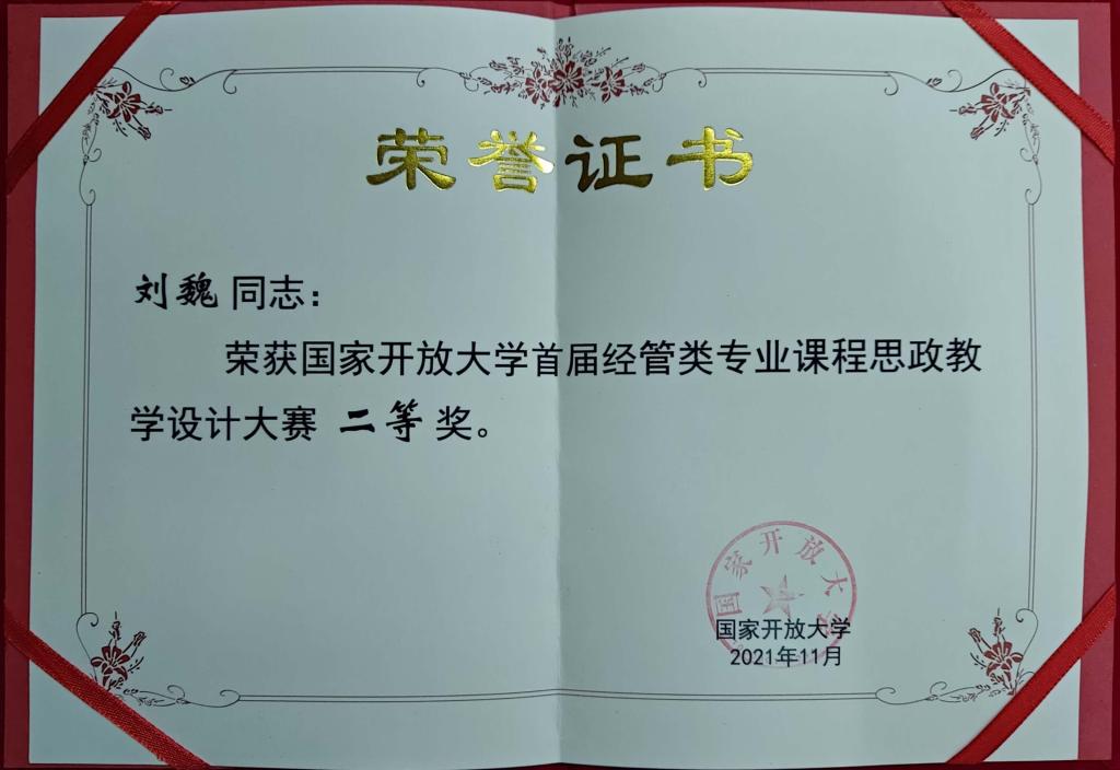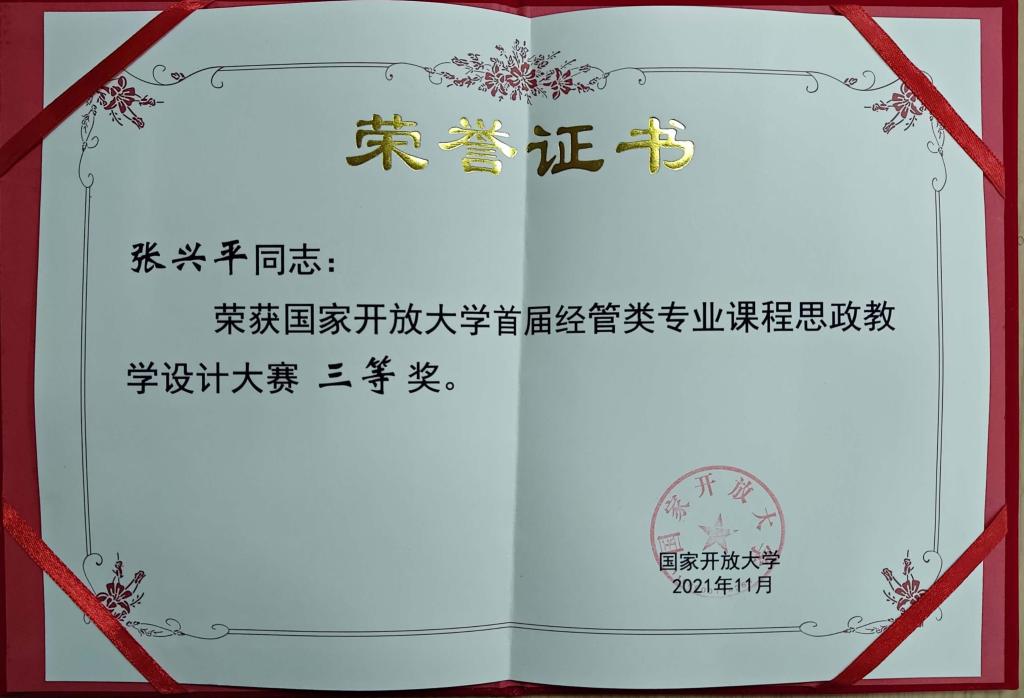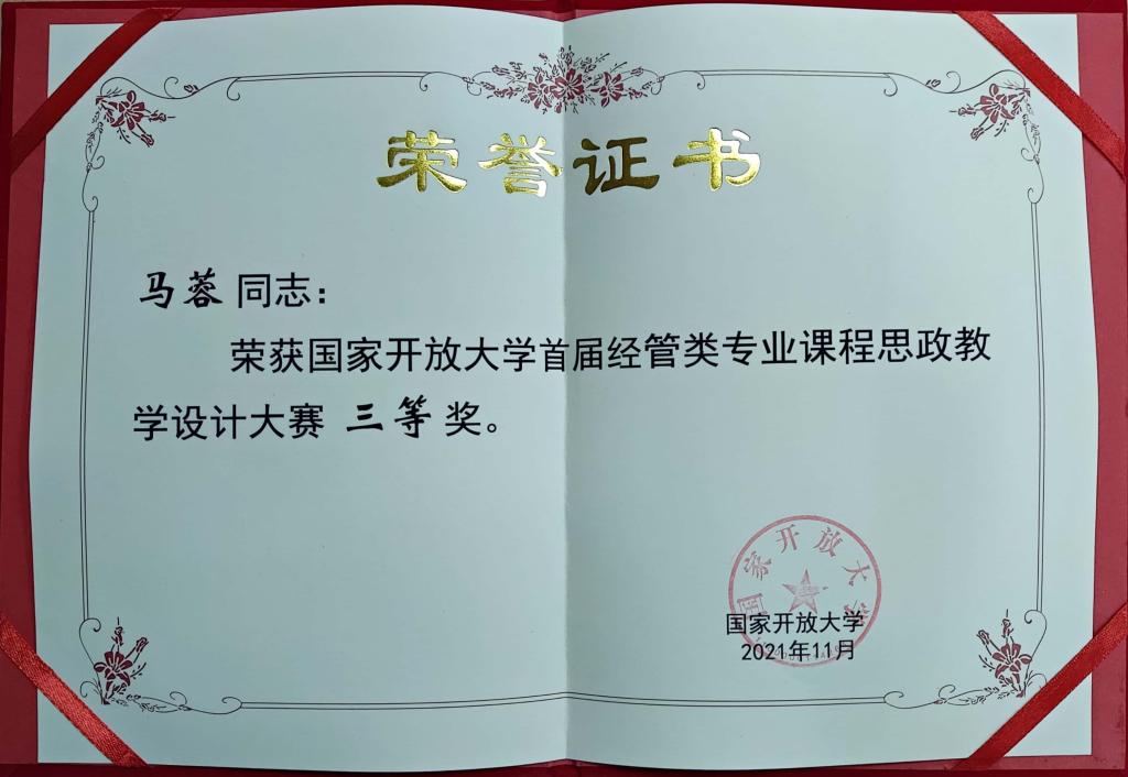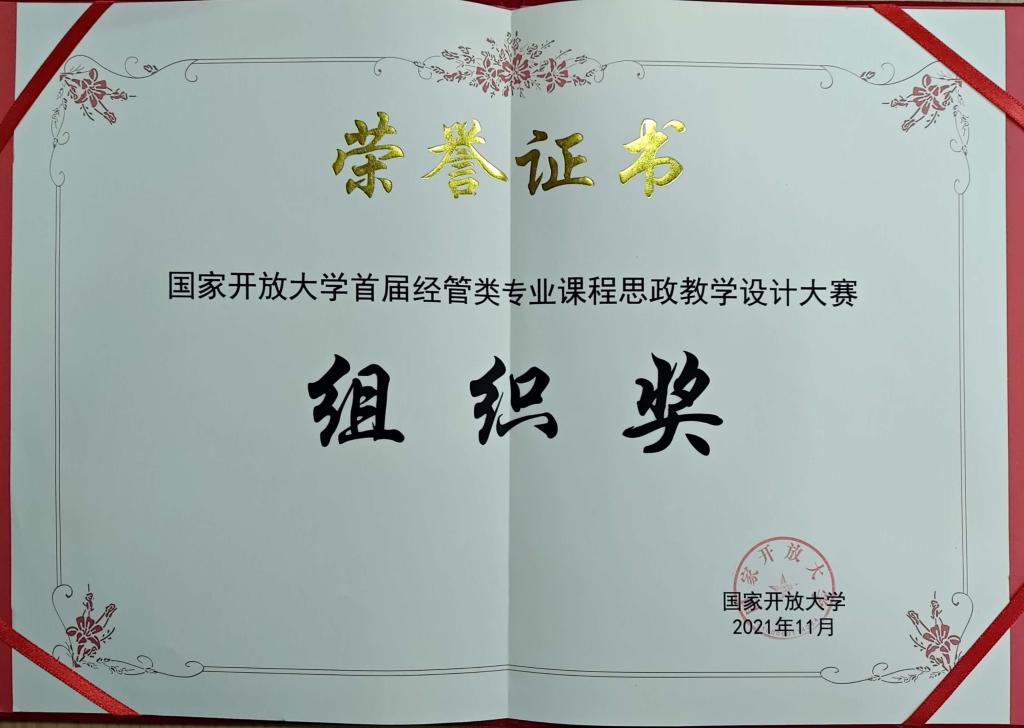 【供稿/远程教育中心】2021年11月,国家开放大学首届经管类专业课程思政教学设计大赛评选结果公布。我校教师作品获二等奖1项,三等奖2项,优秀奖2项,学校获优秀组织奖1项。在国开首届经管类专业课程思政教学设计大赛中,渝中区分校刘魏老师的《西方经济学》获二等奖,九龙坡分校张兴平老师的《高级财务会计》、渝中区分校马蓉老师的《财务管理》获三等奖,市校杨兰老师的《管理学基础》和覃世利老师的《新媒体营销》获优秀奖,我校荣获组织奖。
