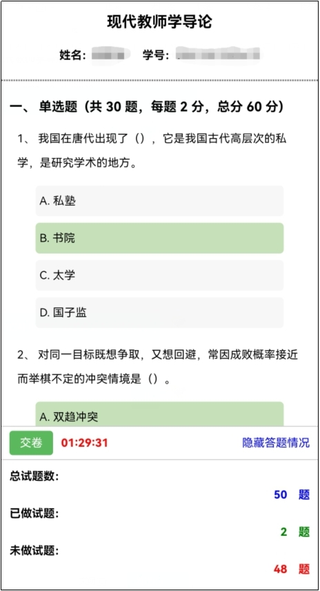 在课程考核改革方面,继续教育学院进一步优化了开放教育本科补修课程考核,开发了开放教育本科补修课在线考试系统。该考试系统适应于手机、电脑、平板等智能终端考试,建立了31门补修课考试题库,题库试题达3000余道,实现了随机生成考试试卷,系统自动阅卷评分功能。此外,学院还开发了开放教育综合素质五学分课程在线作业系统,将作业形式从线下转至线上进行,在方便学生参与考核的同时,有效提升了工作效率,广受师生好评。