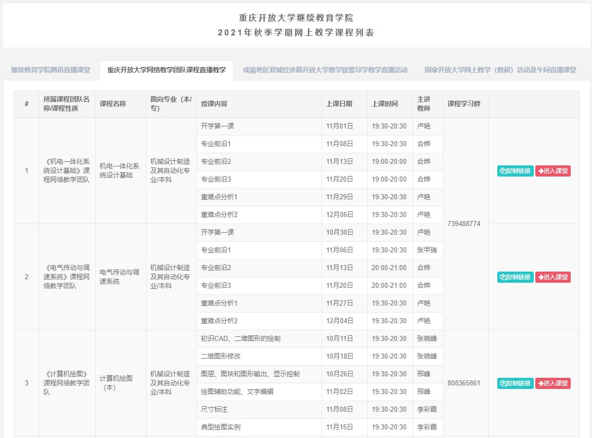 此外,为落实国家开放大学“创优提质”战略,进一步提升学习支持服务质量,近日继续教育学院将国家开放大学网上教学直播课堂、重庆开放大学网络教学团队课程直播课堂、成渝地区双城经济圈开放大学教学联盟导学教学直播活动及学院腾讯直播课堂等各级网上直播课堂信息进行了整合,形成了一站式网上直播课堂通道。学生手机扫描打开通道选择课程点击“进入课堂”登录即可参加直播学习或回放教学视频,参加网上学习更加方便快捷。