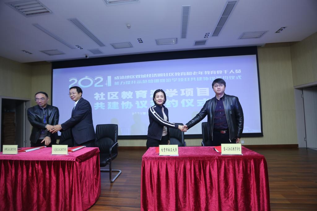 本次培训的最后阶段,举行了“2021年成渝地区双城经济圈社区教育和老年教育游学项目共建协议签署仪式”,来自重庆、四川(成都)的社区教育学院签署了协议,启动了游学项目、游学基地的共建共享工作,为川渝蓉社区教育和老年教育项目合作,充分实现资源共建共享,开启了有益的探索。