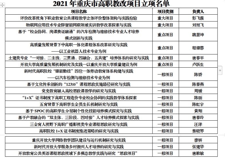 【供稿/教务处】近日,重庆市教委下发了《重庆市教育委员会关于公布2021年高等职业教育教学改革研究项目评选结果的通知》(渝教职成函〔2021〕58号),我校《评价改革视角下职业教育公共课程教学立体评价整体架构与实践检验》等18个项目获批立项,其中重大项目2项,重点项目4项,一般项目12项。此次高等职业教改项目重庆市共立项424项,我校6个项目获得市级资助,教育教学改革项目在立项数量、项目质量及获得资助方面取得重大突破。学校将进一步加强对立项项目研究工作的管理、指导、督促和检查,采取有效措施,保障项目有效开展研究和实践。