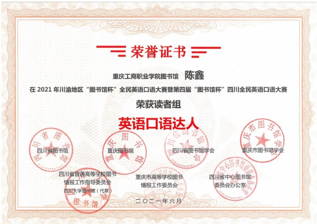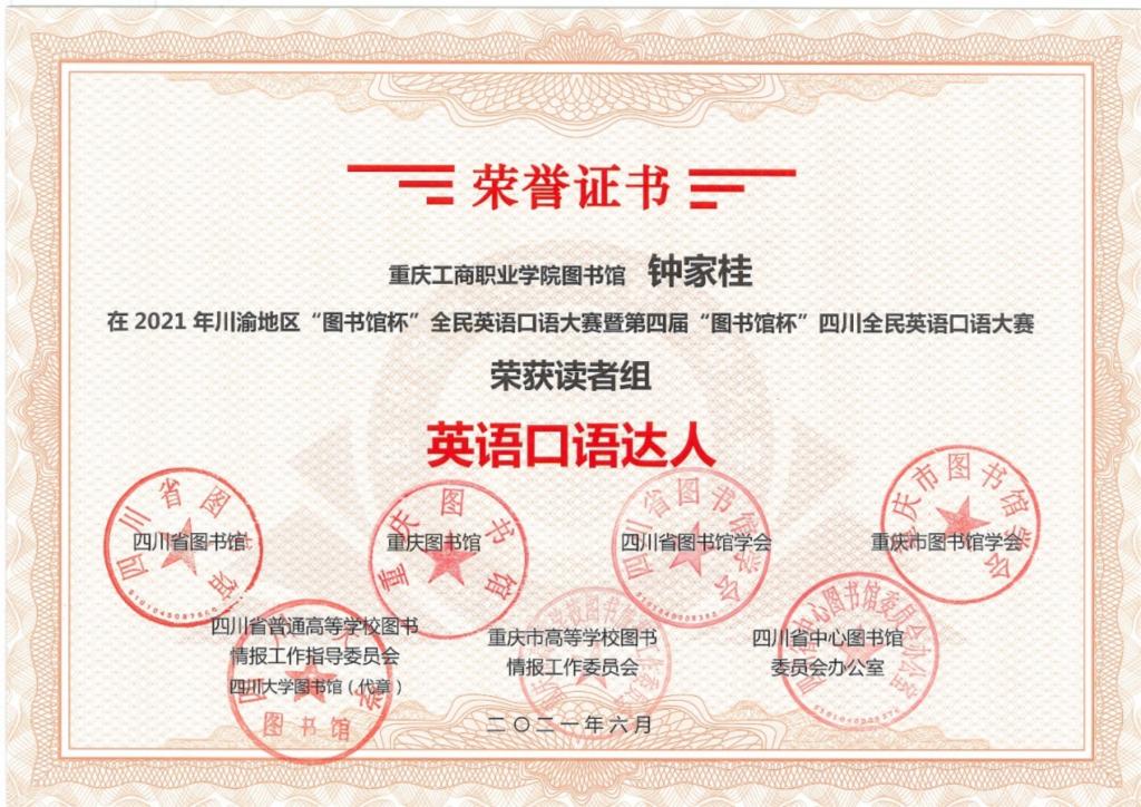 【供稿/图书馆】近日,由川渝两地图书馆和图书馆学会等主办的2021年川渝地区“图书馆杯”全民英语口语大赛暨第四届“图书馆杯”四川全民英语口语大赛圆满结束,我校学生陈鑫、钟家桂荣获大赛读者英语口语达人奖。本次大赛以“百年辉煌,世界听我说”为主题,采用“网络初赛+网络复赛+线上总决赛”模式,评选出优秀奖200人,口语达人200人,一二三等奖20人。