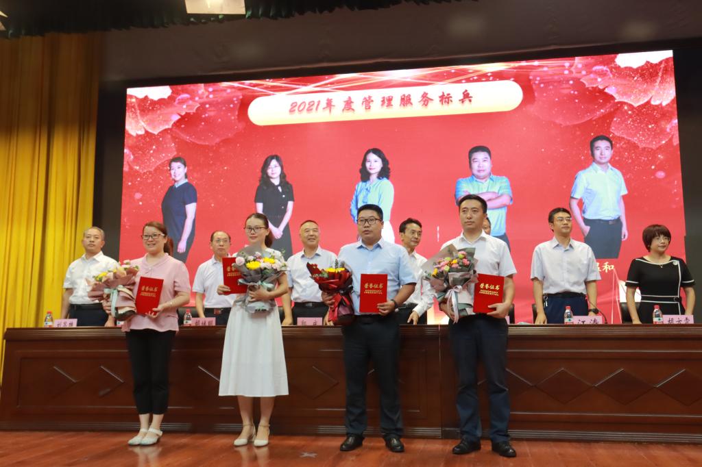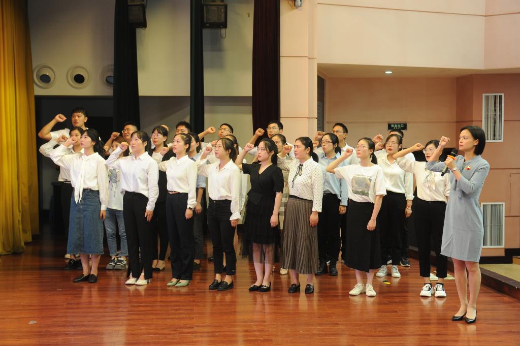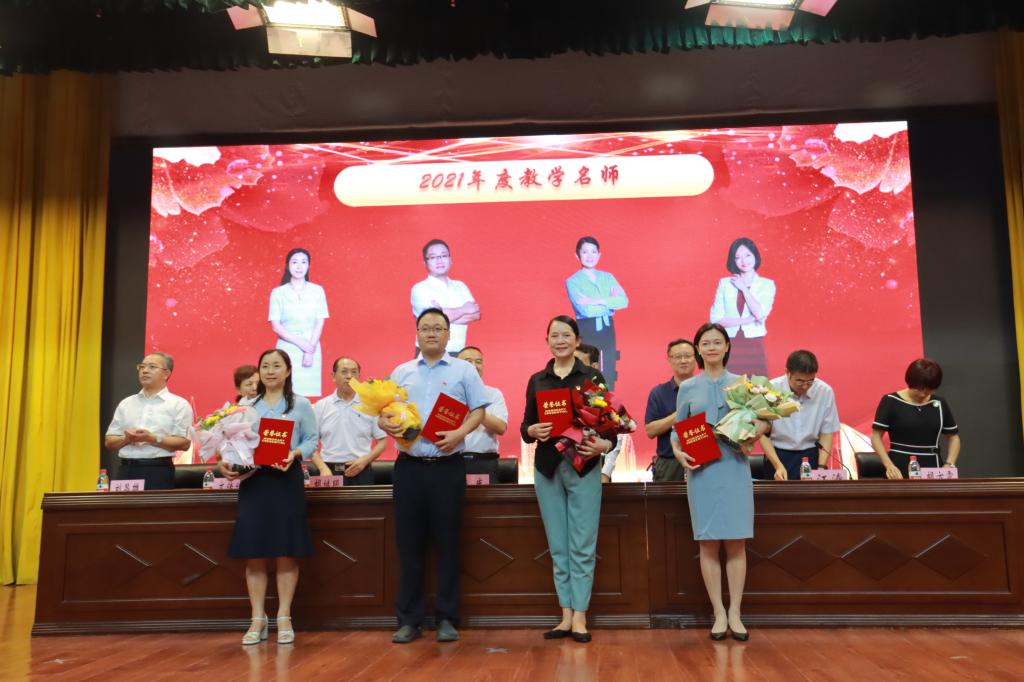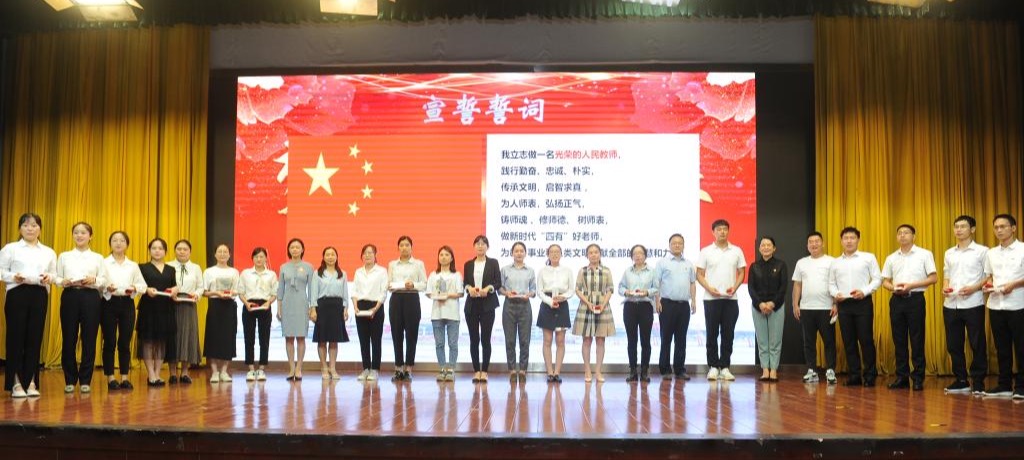本次大会还举行了2021年新入职教师欢迎仪式。在荣获“教学名师”荣誉称号的管理学院教师杨华领誓下,全体新进教职工进行了入职宣誓,任艳君、曾春、马永军、杨华等教学名师为他们授予了教棒与校徽。