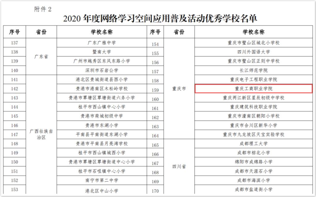 【供稿/网络安全与信息化处】近日,教育部办公厅公布了2020年度网络学习空间应用普及活动优秀区域和优秀学校名单,经各级教育行政部门遴选推荐、材料评审、视频答辩、上网公示等环节,我校同全国191所学校一道,被评为“教育部2020年度全国网络学习空间应用普及活动优秀学校”,重庆仅5所高校入选。