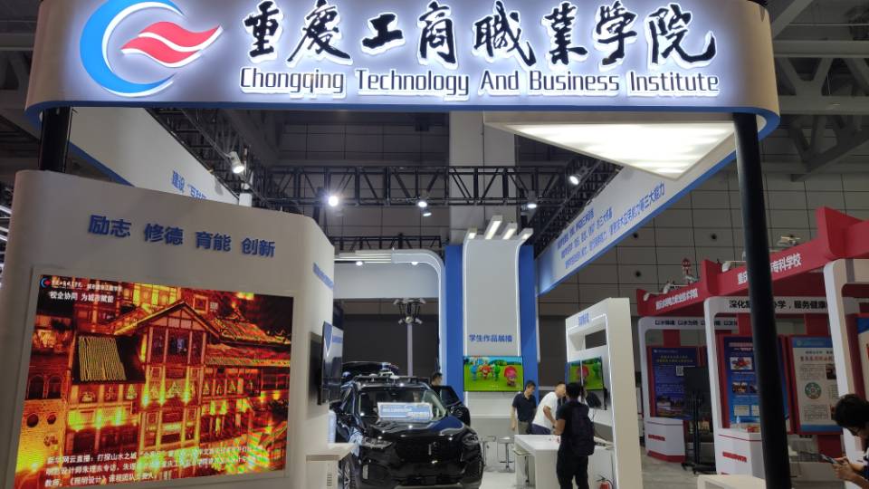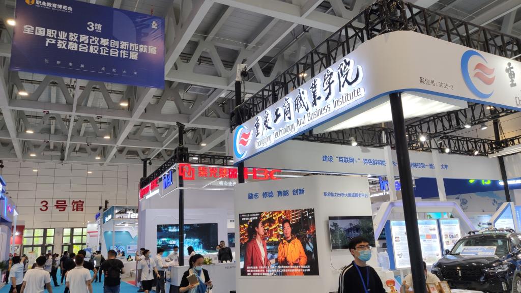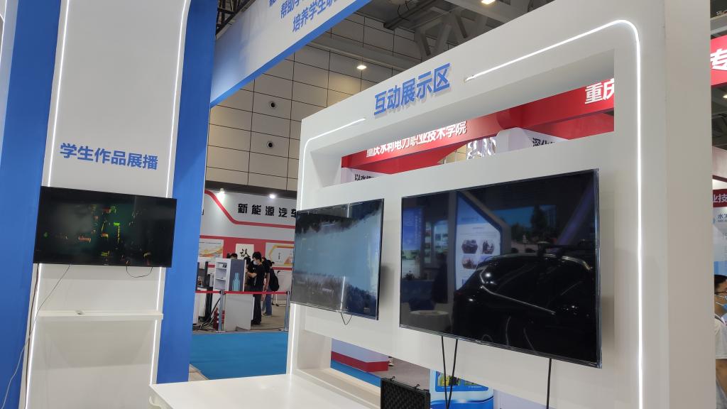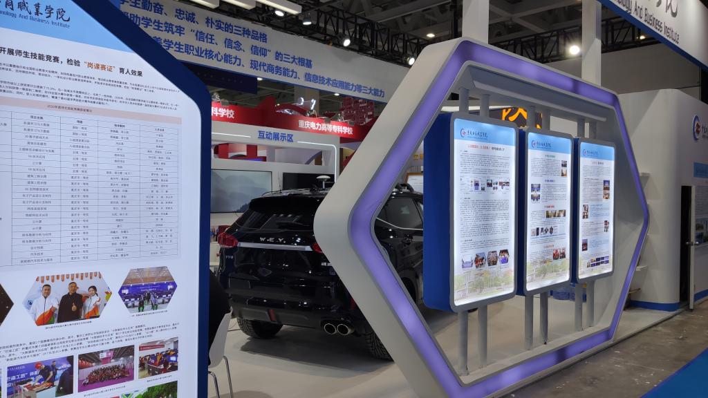 我校在博览会现场设立展台,分综合改革、“三教”改革、互动展示和学生作品四个版块。其中,综合改革版块主要介绍了我校在体制机制、学分银行、思政引领和学生活动中的特色内容;“三教”改革版块主要聚焦我校“1+6双高”专业群建设,全面展示教务处和7个专业群在双高建设中的典型案例;互动展示版块主要包括无人驾驶技术、物联网实训平台、建筑三维建模VR等内容;学生作品版块重点突出方呆呆动画片、走马民间故事等学生创作作品及衍生产品。
