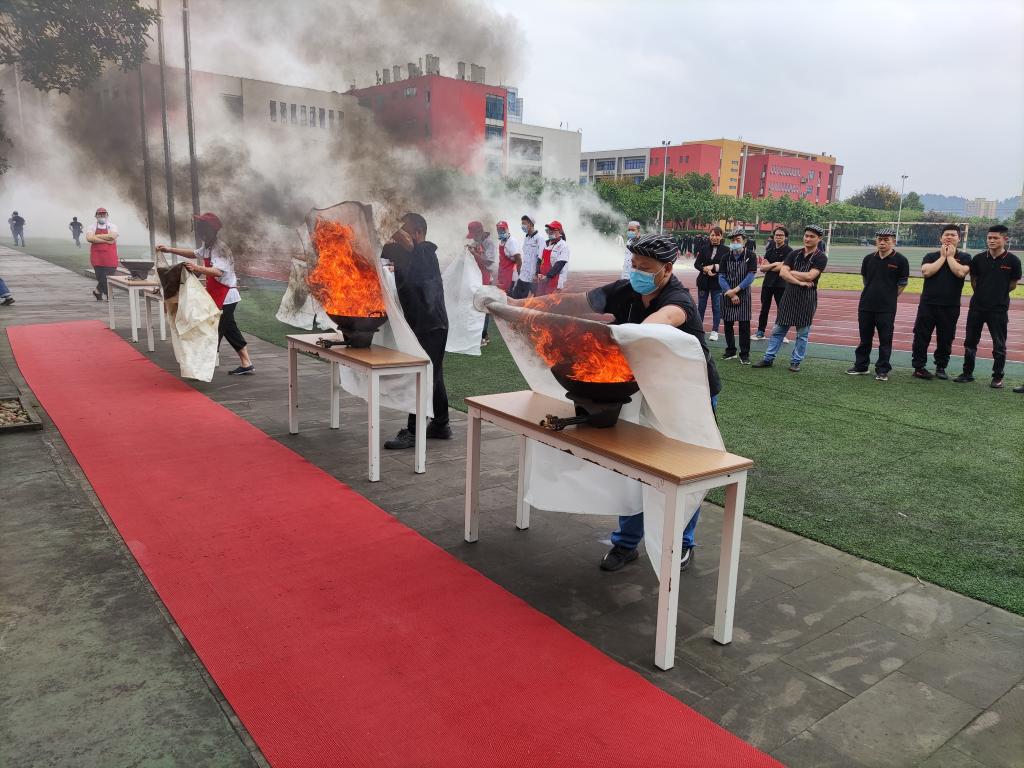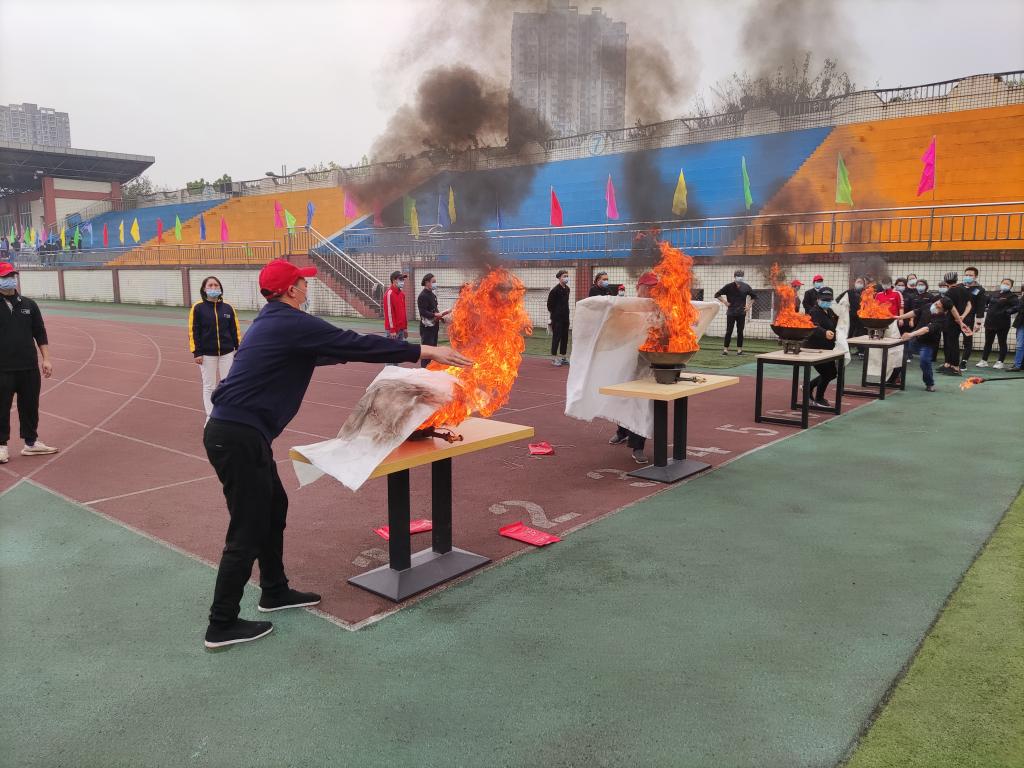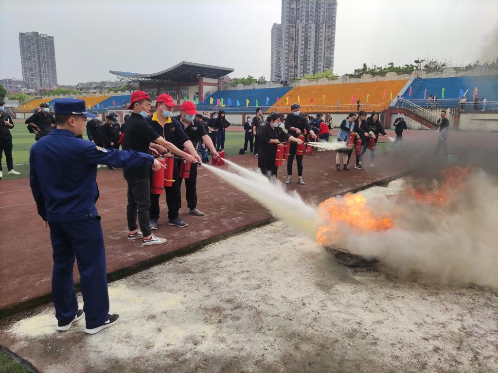 本次培训分别邀请了九龙坡区消防救援支队和合川区消防救援支队教官就食堂、学生宿舍等消防安全重点部位可能存在的火灾隐患、消防器材配备、日常消防安全巡查及火灾事故的应急处置进行了专业讲解,强调了食堂烹饪间和学生宿舍着火后的救火疏散注意事项。随后,参训人员前往运动场开展了灭火实战演练。培训教官现场演示了灭火器、灭火毯的使用方法,参训人员逐一进行了灭火实战演练,体验灭火过程。