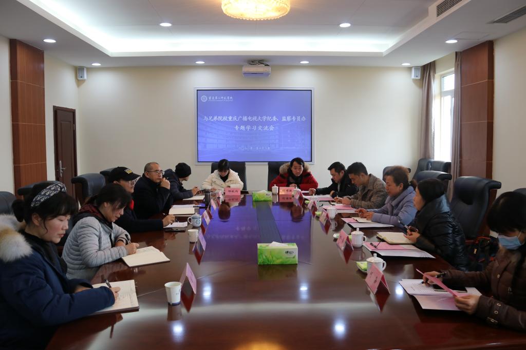 【供稿/纪检监察室】1月22日下午,校党委委员、纪委书记、监察专员文传竹带领专职纪检监察干部赴重庆第二师范学院(以下简称“二师”)开展专题学习交流。二师纪委书记、监察专员张云平及纪检监察室部分同志参加了座谈会及现场交流。
