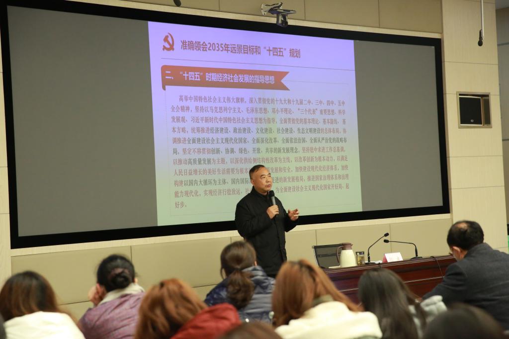李国校长围绕全会的重大战略意义、党中央关于当前和未来一个时期我国发展形势的重大判断等内容进行了宣讲。他勉励大家要联系个人学习、工作实际和未来发展目标,将个人奋斗与祖国命运结合起来,同频共振,讲好感悟、谈好体会。要将全会精神内化于心、外化于行,准确生动地宣讲好全会精神,把思想、行为统一到全会精神上来,兴起学习宣传贯彻党的十九届五中全会精神的热潮。