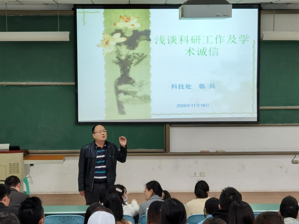 【供稿/党委教工部】为进一步增强我校教师学术诚信意识,充分调动教师科研工作积极性,提高科研课题申报质量,11月18日下午,由人事处和科技处联合举办的科研工作及学术诚信讲座在合川校区D208教室举行,科技处副处长郭兵教授主讲。学校近三年新进教师参加讲座。