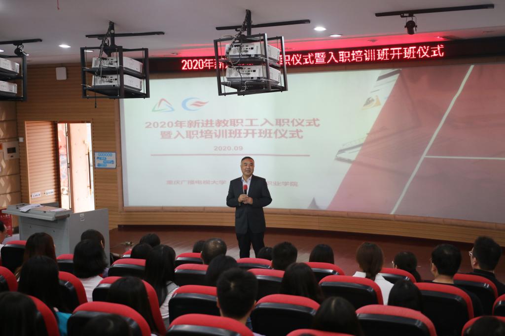 在重庆市优秀辅导员、学校2020年教书育人楷模获得者谭煜颖老师带领下,70名新进教职工进行了庄严宣誓。郭庆书记和李国校长为新进教职工代表授予校徽与教棒。