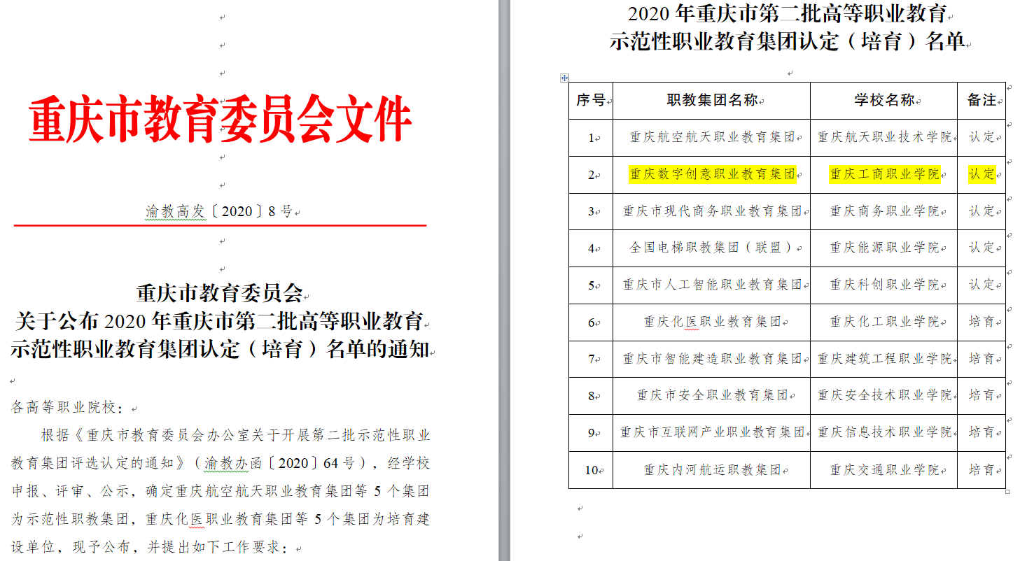 【供稿/对外合作处】近日,重庆市教育委员会发布了2020年重庆市第二批高等职业教育示范性职业教育集团认定(培育)名单,经专家评审,我校重庆数字创意职业教育集团被认定为示范性职业教育集团。