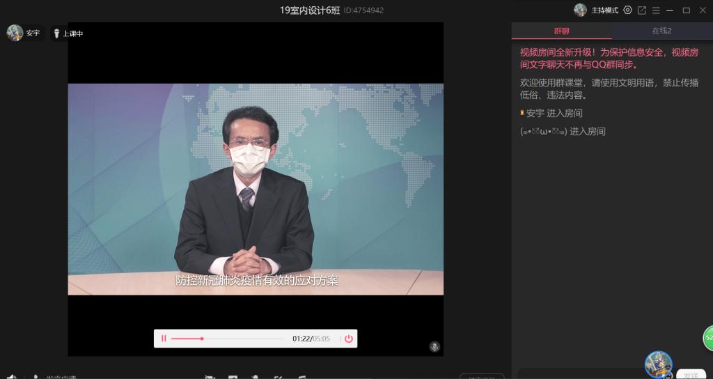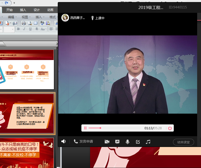 校长李国在课堂中感谢全体教职工和同学们对学校疫情防控工作的积极参与、大力配合和支持,为师生安全作出了贡献;点赞奋战在各地村镇防疫一线的学生党员志愿者,用实际行动书写着工商学子的青年责任和青年担当;寄语同学们要更加关心自然与社会,传递善良与爱,从灾难中反思自我,在困境中沉淀与奋发;要求同学们做好自身防护,充分利用网上学习资源,积极与老师和同学互动沟通,真正做到“停课不停教、不停学”。