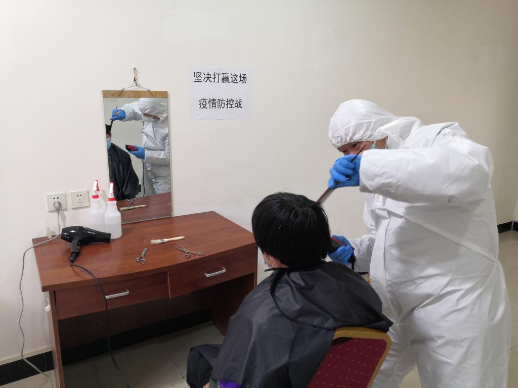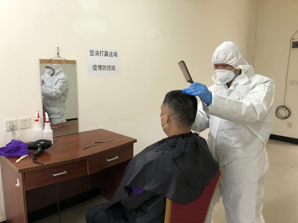 为确保疫情防控工作万无一失,理发工具现场消毒,理发师佩戴口罩、身着防护服,理发罩衣用一次性雨衣代替。教职工预先登记、等候电话通知、有序到场,有效避免了集中等候可能造成的交叉感染风险。