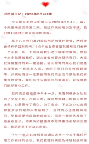 此次援鄂,她们被分派到了武汉大学人民医院隔离病区。2月4日,正式进入实战岗位前,为避免相互感染,况柯羽剃掉了心爱的秀发。她在日记中写到:“头发剃了还会在生长,如果防护措施做不好就害怕引起相互感染。”