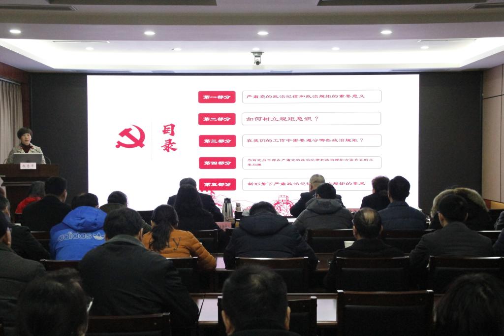 党委副书记周曦同志作了题目为“树牢政治意识、规矩意识,筑牢思想防线”的政治能力专题培训,从严肃党的政治纪律和政治规矩的重要意义、如何树立规矩意识等内容,明确了干部在工作中需要遵守哪些政治规矩,指出了当前党员干部在严肃党的政治纪律和政治规矩方面存在的主要问题,提出了新形势下严肃政治纪律和政治规矩的要求。
