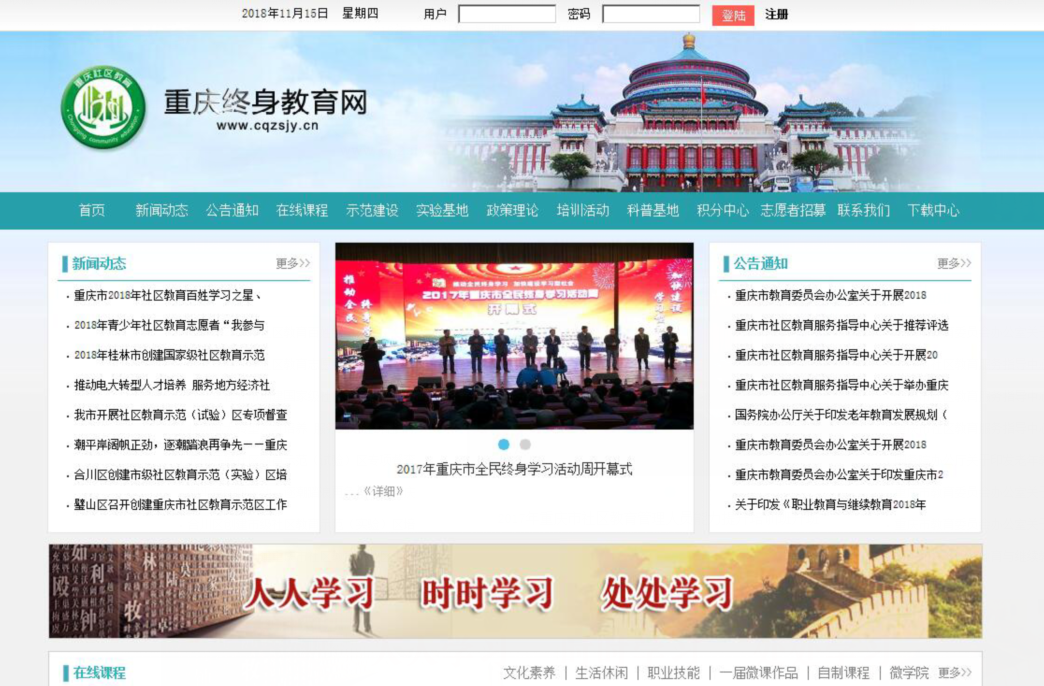 深入推进社区教育,服务全民终身学习。一是运用系统办学、贴近社区的优势,组建社区教育“四级网络”联盟办学体系,成立了19所社区教育学院、290所社区学校、1400多个社区学习中心。构建了以专职人员为骨干,兼职人员和志愿者为主体的社区教育教学与管理队伍。二是运用信息化技术手段,构建了优质教学资源向社区传播和支持服务的多种信息化平台,为市民提供了免费学习的平台和智慧化的学习环境。三是运用“两校一体”、跨界融合的优势,整合高等教育、职业教育以及成人教育的优质资源,开发了多类型、多模块的市民终身学习课程。四是积极开展全市社区教育管理干部、专职教师、社区居民和志愿者培训,培训人数达3000人。先后获得了全国十佳终身学习活动品牌、全国事迹最感人的百姓学习之星、全国100佳百姓学习之星、全国终身学习活动品牌、重庆市终身学习活动品牌、全民终身学习活动周“特殊贡献奖”等荣誉;“服务市民终身学习需求的社区教育课程开发与教学模式创新探索与实践”项目,获得重庆市人民政府第五届高等教育教学成果奖二等奖。重庆电视台、重庆晨报、大渝网、华龙网、中国新闻社、凤凰网等多家市内外媒体对社区教育作了专题报道,社会影响与日俱增。