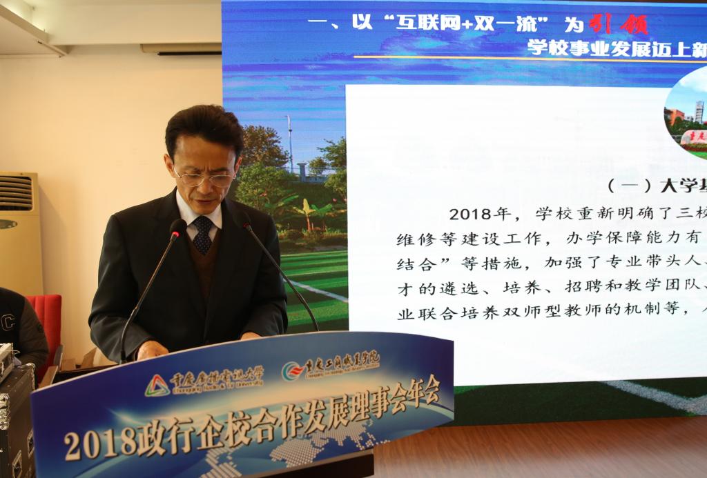 【供稿/宣传部】1月11日上午,我校2018政行企校合作发展理事会年会在华岩校区三楼会议室召开。学校全体校领导、副处以上干部,32家政行企校合作发展理事会成员单位相关代表出席了会议。