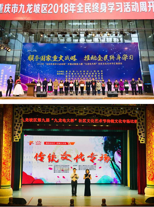打造社区教育品牌,点燃发展新引擎。一是构建社区教育组织体系,完善社区教育阵地。推进以“区社区教育学院—镇(街)社区学校—社区(村居)社区学习中心”为主体架构的社区教育三级办学体系建设,目前已在19个镇(街)建立了社区学校,75%的村镇建立了学习中心,逐步形成了“一校N区”的办学阵地。成立区老年大学开放教育学院,丰富老年教育供给渠道,最大限度满足老年群体学习需求。二是在全市率先开展区政府购买社区教育服务试点,着力构建政府购买社区教育服务的新机制和项目驱动新引擎,并将社区教育纳入九龙坡区对镇(街)的年度综合目标考核体系。三是创建社区教育品牌项目。首创并连续九年开展“九龙电大杯”社区文化艺术节、全民终身学习活动周活动,建设了社区教育东西部两大实验基地、六个社区教育数字化示范学习点,上线运行了九龙坡区全民终身学习网站,开展了数字化学习推广、“四进社区”(教育服务、传统文化、科普教育、高雅艺术进社区)、种子计划、社区教育干部培训等活动,得到广大社区居民的喜爱和支持。近年来,学校为全区打造了两个全国社区教育品牌活动、两个全国社区教育示范街镇、三个重庆市社区教育品牌活动、四个重庆市社区教育品牌课程、五个九龙坡区社区教育示范街镇。向全国推送了三个全国百姓学习之星,28个全区百姓学习之星,有力地促进了全区全民终身学习的发展。学校所在的九龙坡区先后被评为重庆市社区教育示范区、全国数字化学习先行区、全国社区教育示范区。