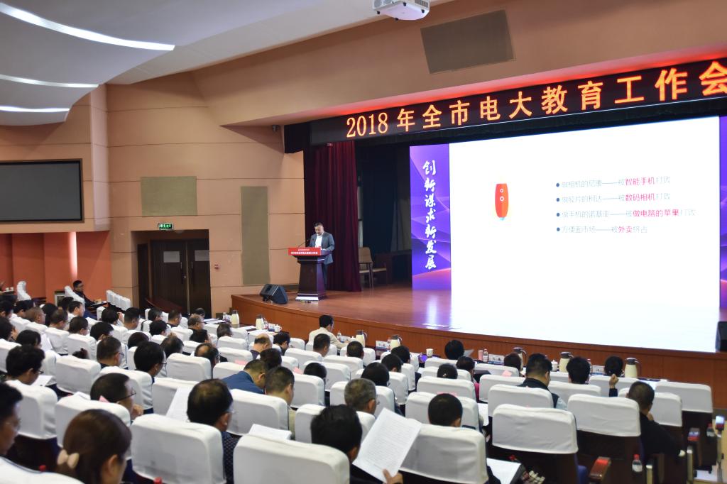 市电大党委书记郭庆在大会上作了题为“面向新时代,抢抓新机遇,以‘奋进之笔’努力推进电大事业新发展”的主题报告。他以智能手机的故事入手,告诉大家时代的发展不会因任何人的消极缓慢而停止。在中国特色社会主义进入新时代的今天,我们要认真贯彻落实十九大报告对教育工作提出的新任务新要求,特别是“推进教育公平”“实现高等教育内涵式发展”“办好网络教育”“办好继续教育,加快建设学习型社会,大力提高国民素质”等战略要求,要切实担负起时代赋予教育现代化的新使命。全市电大系统应主动走向地方社会中心,根植于地方需要,引领地方社会发展。郭书记指出,站在新的历史起点上,大刀阔斧地推进改革是积极贯彻落实党的十九大精神最好的方式。今年,市电大党政工作要点明确提出在电大系统推进“一校一策”综合改革,他强调,“一校一策”要遵循科学思维、强化问题导向、坚持因地制宜、瞄准特色发展,全市电大系统要抓住“一校一策”契机,整体谋划发展,着力推进各项改革。针对如何贯彻落实中央各项决策部署和市委部署安排,推动全市电大系统转型发展,郭书记提出了几点要求。一要统一思想,深化认识,凝心聚力促发展。希望大家在思想上行动上对转型发展形成共识,稳方向、稳目标、稳预期,抓好落实、提高质量、开拓创新。二要主动作为,形成合力,真抓实干促改革。要不断深化教育供给侧结构性改革,探索新型教育服务供给方式,积极探索“一校一策”实施办法,主动谋求发展。三要积极调研,转变作风,身体力行抓落实。全市电大系统要切实增强兴调研转作风促落实的思想自觉和行动自觉,靠作风吃饭、拿实绩说话,在信念过硬、政治过硬、责任过硬、能力过硬、作风过硬上下功夫见实效。