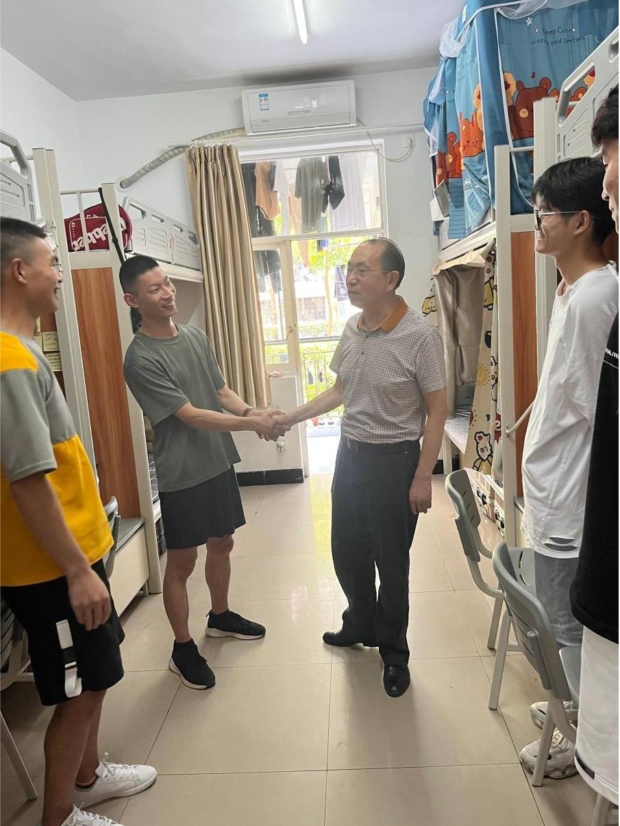 在1115和1113寝室,胡继明副校长与2021级计算机专业同学们进行了交流,亲切询问同学们的学习、生活情况,赞扬扩招退役军人同学依然保持着“军旅生活”的良好习惯。