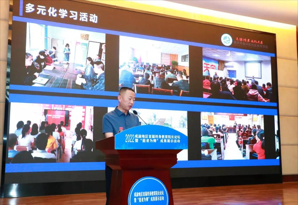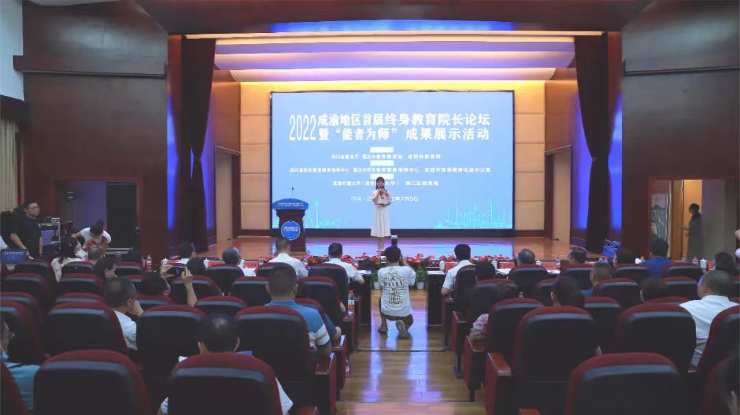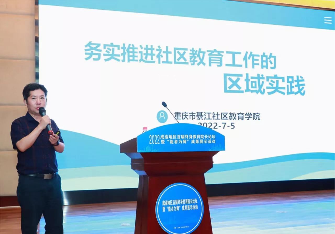 【供稿/终身教育中心】7月5日,由重庆市社区教育服务指导中心、四川省社区教育服务指导中心、成都市终身教育促进办公室联合主办的2022年成渝地区首届终身教育院长论坛暨“能者为师”成果展示活动在成都举行。合川广播电视大学(社区教育学院)院长陈瑜、綦江区社区教育学院院长霍永淮作为重庆方院长代表在论坛上作交流发言,他们以“能者为师”为基点,从理论层面和工作方面全方位展示了各自地区社区教育师资队伍、课程资源、品牌项目建设的经验与智慧,并就下一步如何开展能者为师活动做了思考和展望。