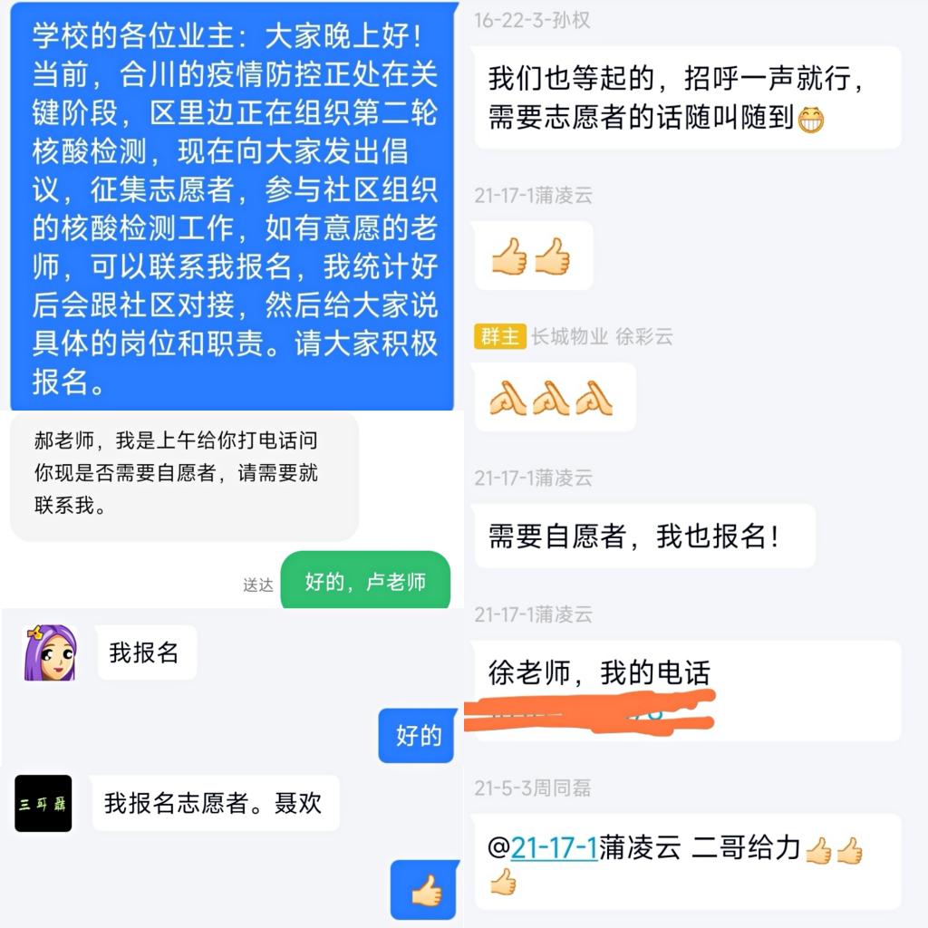 “我已到达指定工作地点,等待统一安排……”三名同志紧急奔赴合川区合阳城街道核酸检测点,配合医务人员、社区工作者做好核酸检测工作事宜,指导群众扫码测温、耐心为市民释疑解答,协助点位顺利完成大规模核酸筛查工作。“我们做了一点实在而有意义的事,值得记忆。”魏佳宏老师表示,疫情险、任务重,作为党员愿意冲锋在前、义不容辞,为合川区疫情防控贡献力量。据悉,在本轮疫情防控中,魏老师与其爱人均主动申请加入志愿者行列,用行动诠释共产党员的责任与担当。