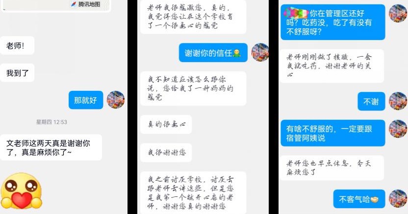 她也有240个“孩子”,他们今年大二了。学院有位同事请了病假,需要有老师协助处理线下工作,文老师顶住压力毅然接管了这240个学生。在两个大班群里,文老师是一个“话痨王”:通知核酸检测,转发网络招聘,传达最新消息,进宿舍进课堂,联动班委关注上课出勤和异常情况等。虽然只是临时辅导员,但她依然尽心尽责对待每一位学生。学生的父亲危在旦夕想回家见最后一面,她立即联系家长征得同意上报学院,在经得学校同意后帮助学生办理手续离校并密切关注学生返家途中的安全。另一个学生因近期心理状态较差影响学习生活,与其进行深入谈心并陪同前往医院就诊。“老师我很感激您,让我有了安心的感觉。”看到学生发来这样暖心的话语,辅导员文杰觉得一切都不辛苦。