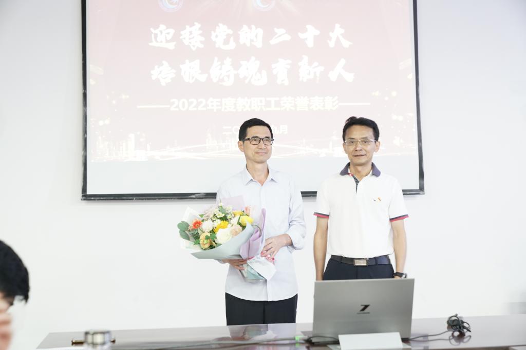 图为今年9月,李国校长为即将荣休的刘健教授献花