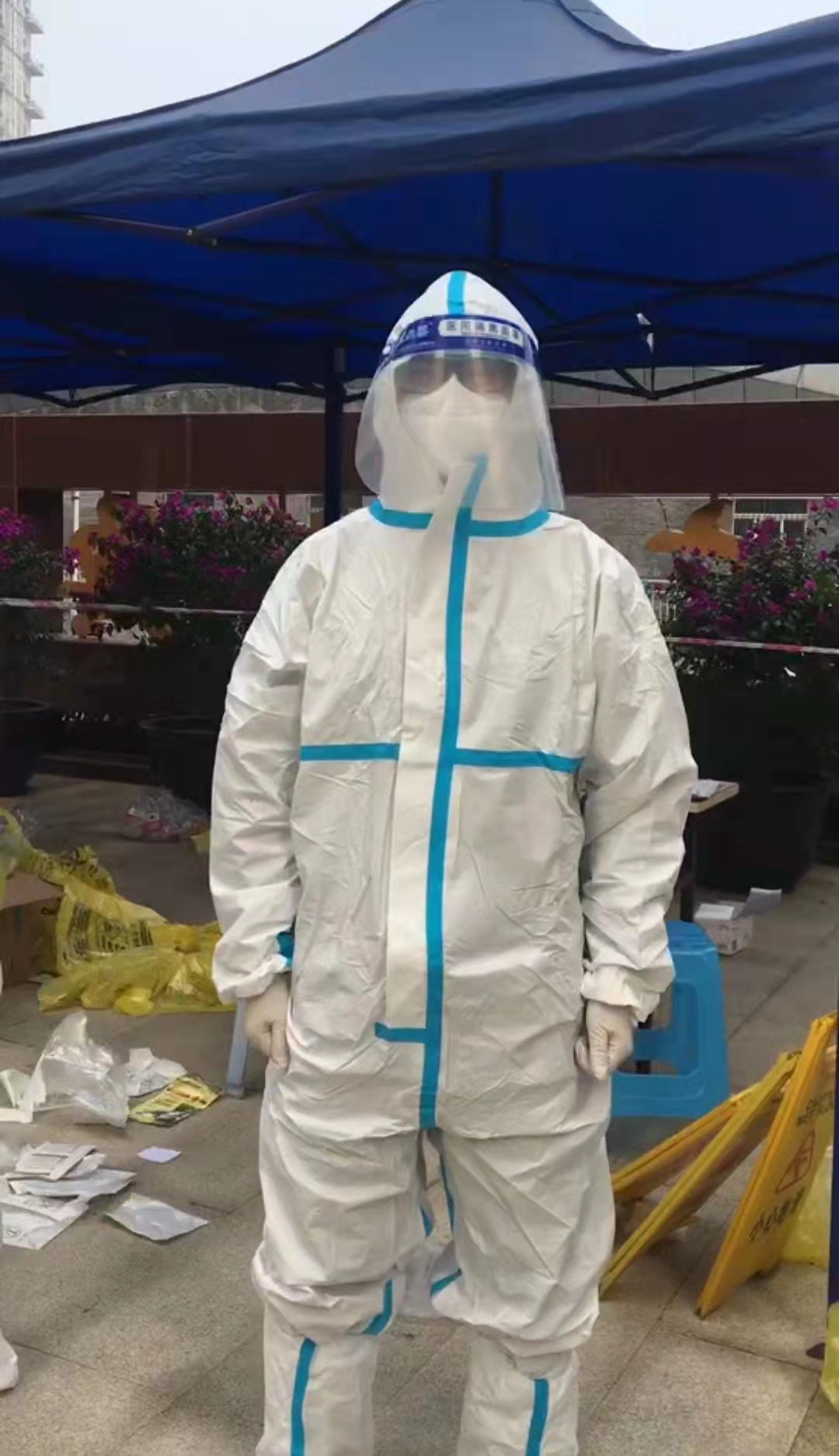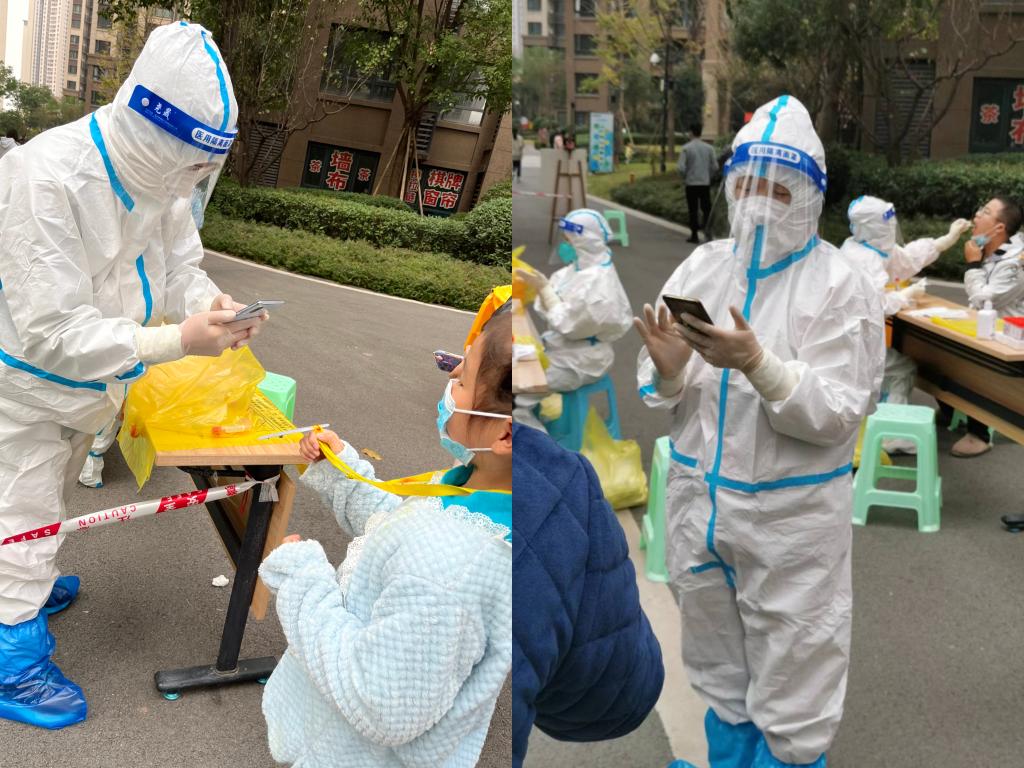 后勤党总支合川校区党支部唐玲同志,在得知所在社区需要志愿者时,积极响应号召,主动下沉社区,做起了一名抗击疫情的志愿者。唐玲同志协助医护人员对小区隔离人员进行上门核酸采集,由于是步梯房且人员分散在各楼栋,穿着密不透风的防护服,从早到晚,几栋楼爬完,汗水早已把衣服和头发浸湿,腿也肿了。即便如此,第二天唐玲同志仍然精神抖擞的出现在现场,开始新的工作,顺利排查完成200多个人员信息。志愿者的工作虽然辛苦,但在唐玲同志看来,这是一名党员的“自觉”,也是“分内之事”。与医护人员和社区工作人员一道,抗击疫情守护家园,为战胜疫情贡献自己的一份力量。