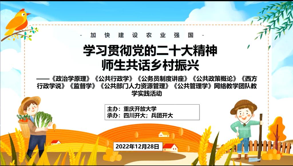 【供稿/创新教育学院】12月28日晚,我校联合兵团开放大学和四川开放大学,召集行政管理专业《政治学原理》《公共行政学》《公务员制度讲座》《公共政策概论》《西方行政学说》《监督学》《公共部门人力资源管理》《公共管理学》等八门课程网络教学团队,线上举行了网上教学实践活动,深入学习宣传党的二十大精神,师生共话乡村振兴。