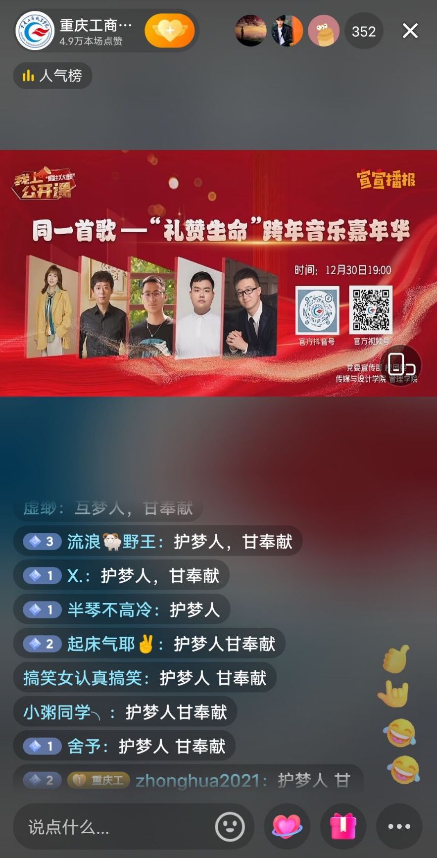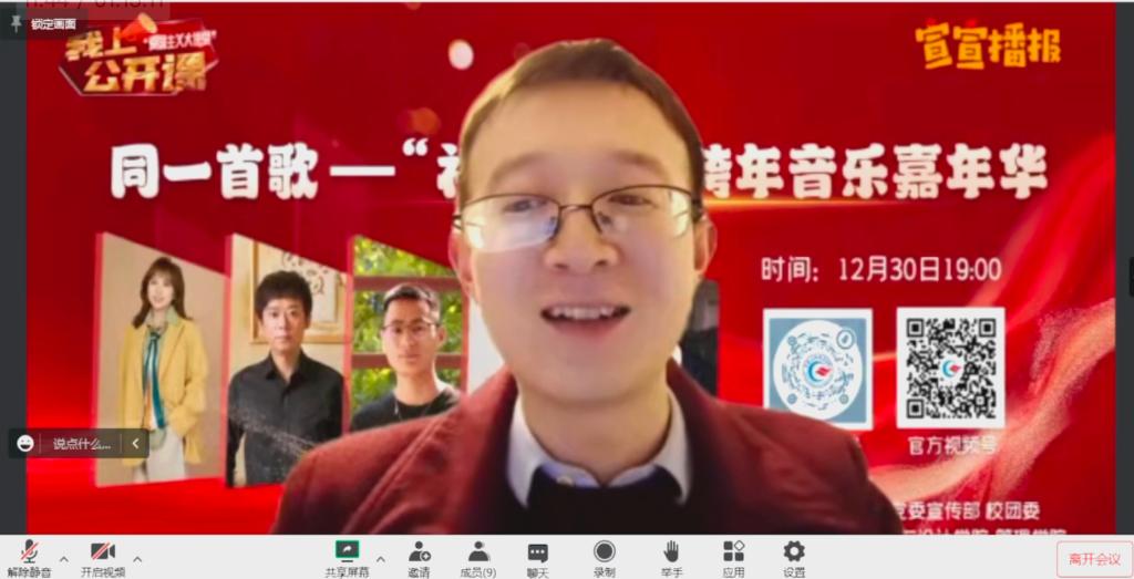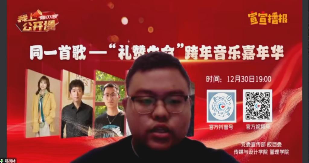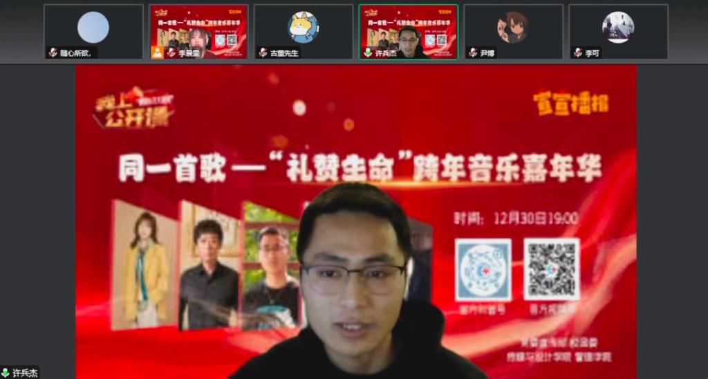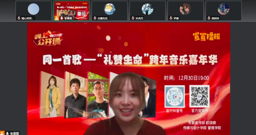 当晚,“同一首歌——‘礼赞生命’专题音乐思政课”以“陪伴式”“云跨年”方式温情上演,由传媒与设计学院教师作词作曲并献唱的五首校园生命教育原创歌曲精彩亮相课堂,开启一段特殊的“音乐与生命”对话之旅。同时,授课过程中还穿插了歌曲创作故事分享、奋斗励志故事宣讲等,师生们围绕生命的孕育、成长、绽放、凋零与重获新生,畅聊过往的遗憾、成长与收获,表达对未来的憧憬、希冀与祝愿,共同唱响生活奏章,鸣响理想和弦。