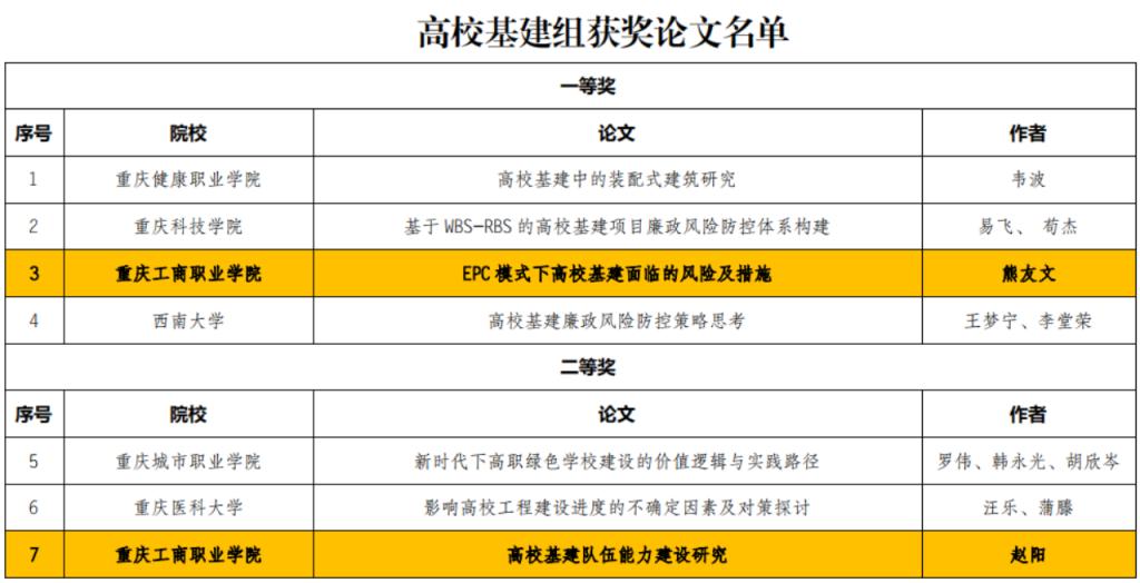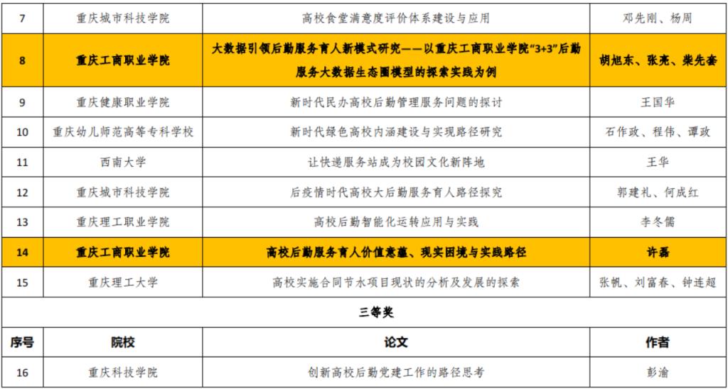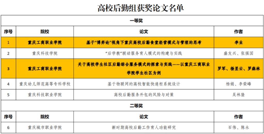 【供稿/后勤党总支】近日,重庆市教育委员会结果公布了2022年高校基建后勤研究论文征集评选活动的结果,我校各有3篇论文分获一、二等奖,为全市获奖论文数量最多高校。