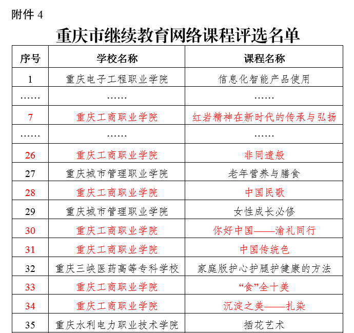 【供稿/终身教育中心】近日,重庆市教委公布了2023年职业教育继续教育提质培优项目评选结果,我校获评“重庆市示范性继续教育基地”和“重庆市社区教育示范基地”;《红岩精神在新时代的传承与弘扬》《非同遗般》《你好中国——渝礼同行》《中国民歌》《中国传统色》《“食”全十美》《沉淀之美——扎染》等7门课程获评重庆市继续教育网络课程。