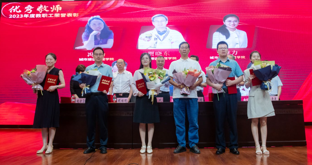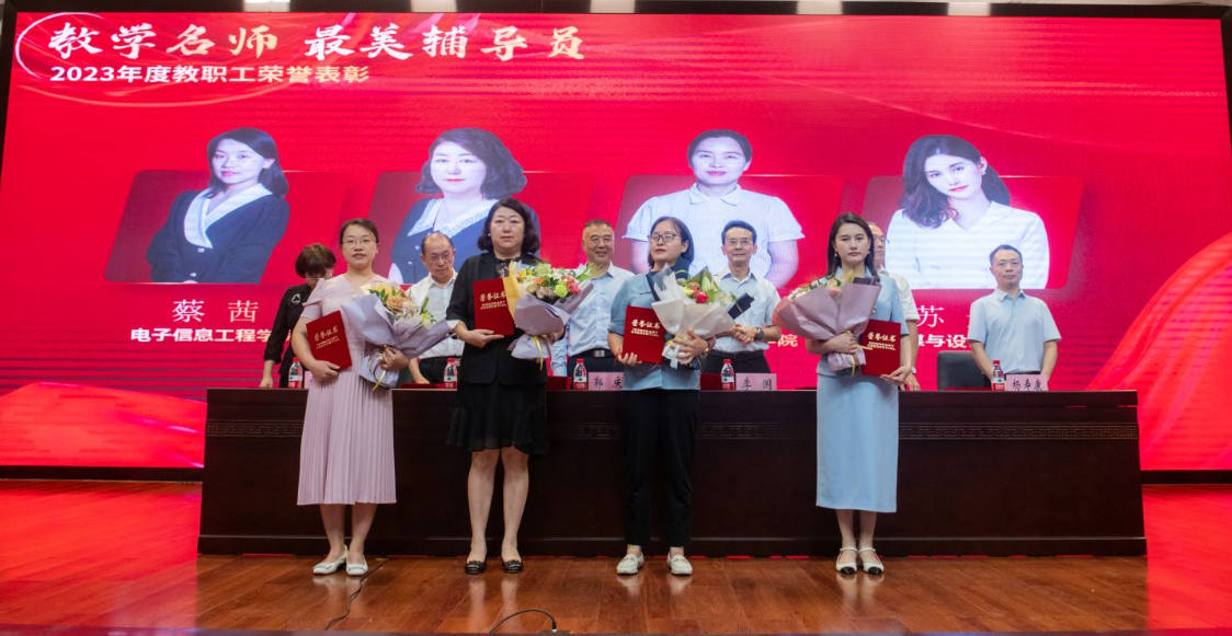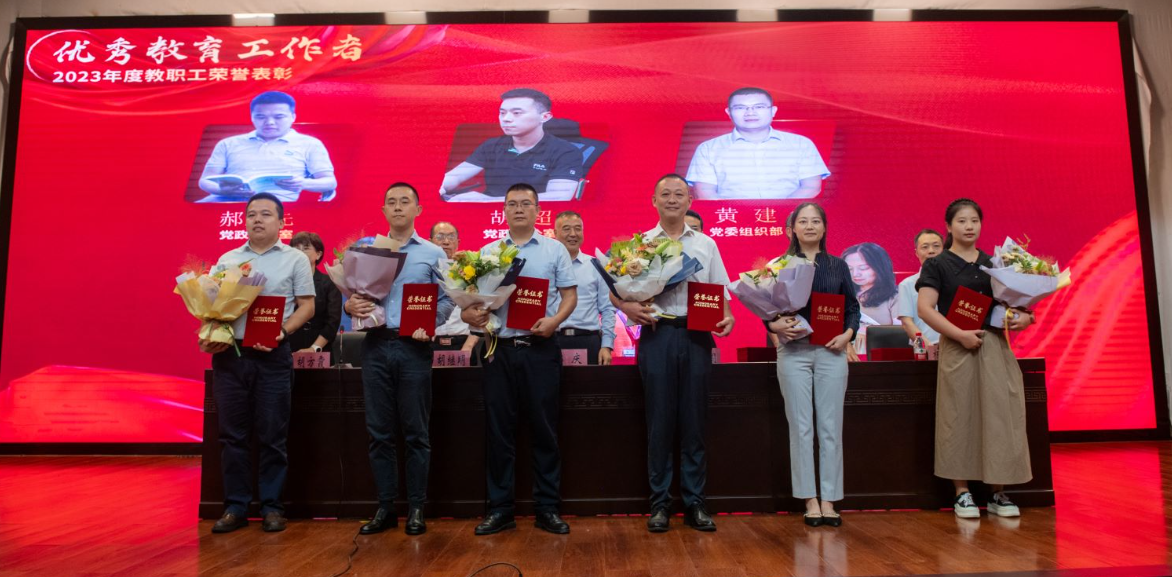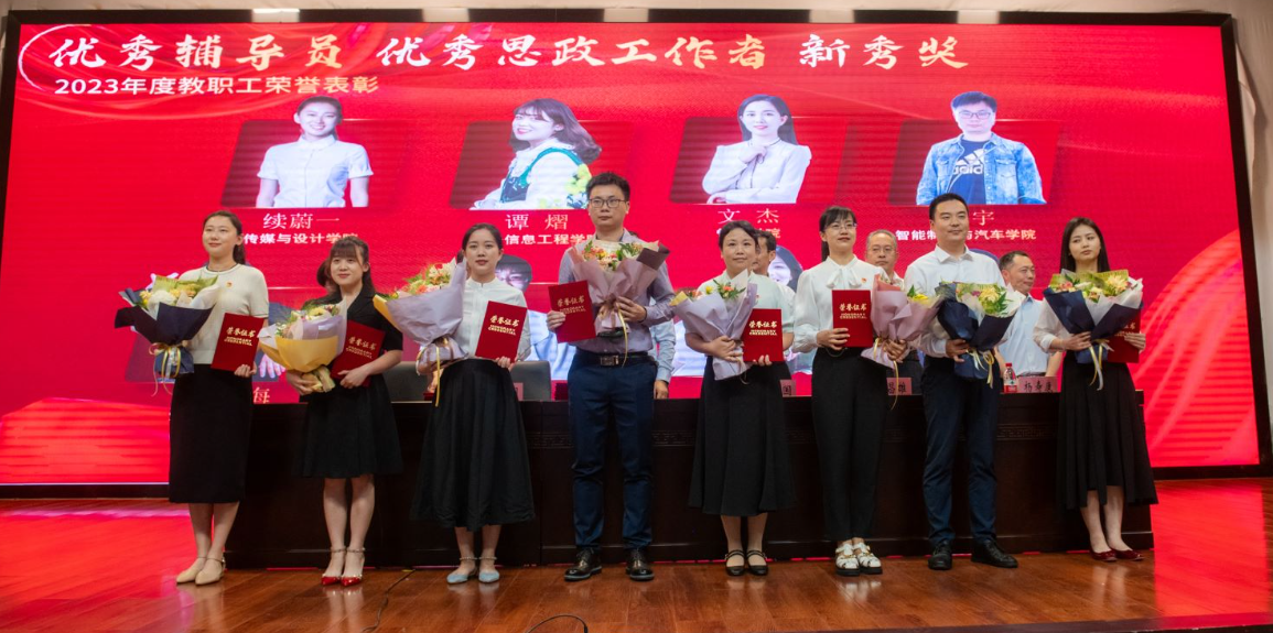 会上,副校长刘昌雄宣读了学校《关于表彰2023年度教职工各类荣誉的决定》,与会校领导依次为荣获各项荣誉的教职工个人颁奖,党委书记郭庆、校长李国为荣获特别荣誉奖的“全国五四红旗团支部”传媒与设计学院团总支、“职业教育国家在线精品课程”《生活色彩美学》《工程造价管理》课程团队颁奖。荣休教师代表王晓君回顾了与学校共同经历的37年光阴岁月,优秀教师代表贾晓东讲述了青年教师成长故事,并带领新入职教师庄严宣誓。新入职教师代表在铮铮誓言下郑重接受李国校长授予的教棒,表达忠诚党的教育事业,为国家繁荣和民族振兴努力奋斗的坚定决心。