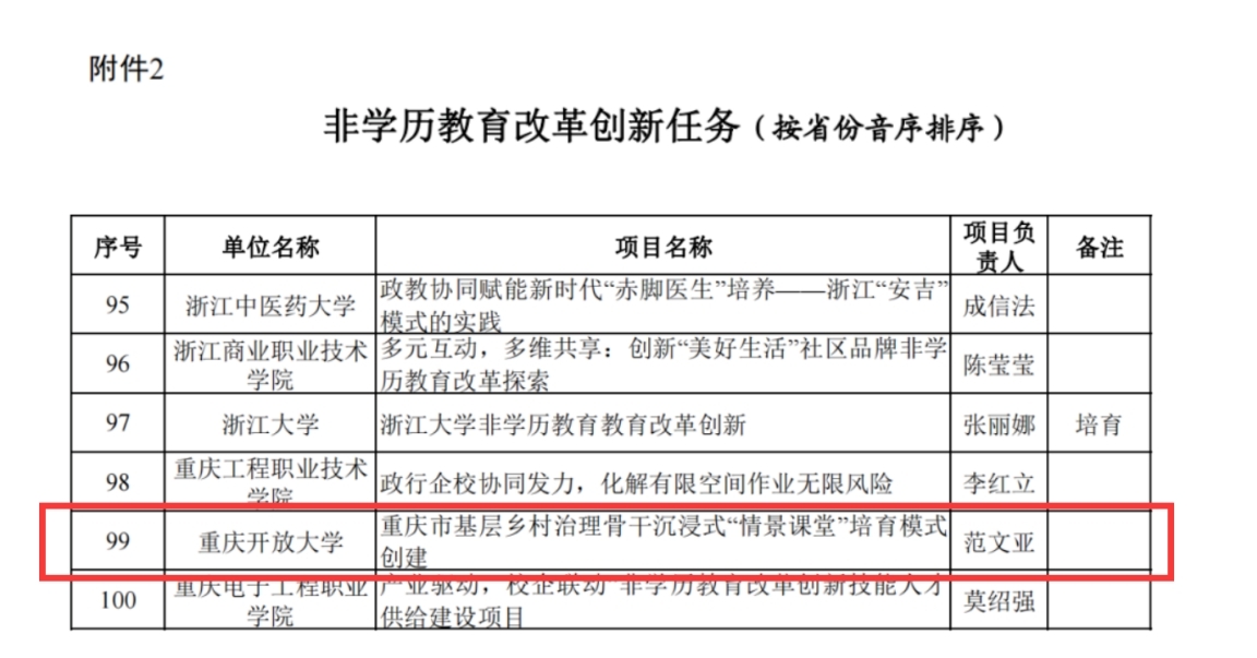 【供稿/党委宣传部】日前,教育部公示2023年学习型社会建设(高等继续教育领域)重点任务名单。我校项目“重庆市基层乡村治理骨干沉浸式‘情景课堂’培育模式创建”(项目负责人:范文亚)入选100项非学历教育改革创新任务名单。