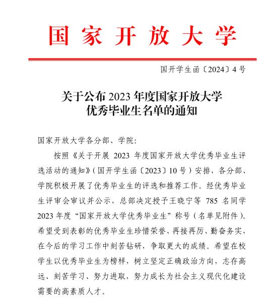 【供稿/远程教育中心】近日,国家开放大学发布《关于公布2023年度国家开放大学优秀毕业生名单的通知》,我校蒲小平、谷汶欣等24位同学荣获“国家开放大学优秀毕业生”称号。