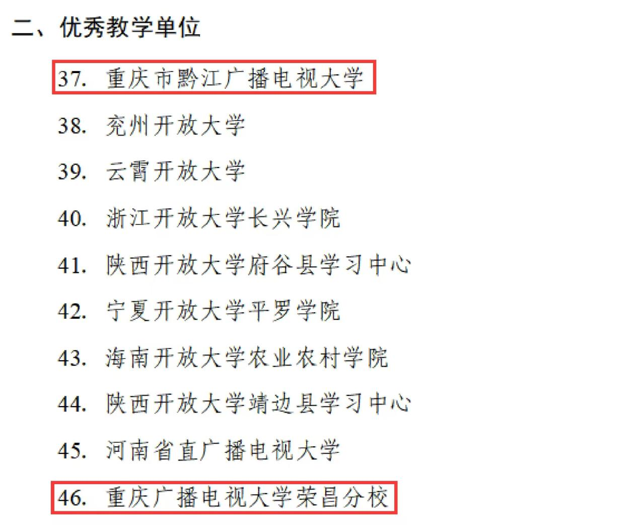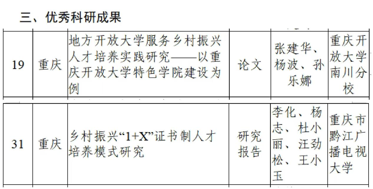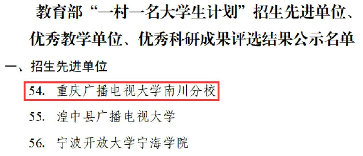 【供稿/远程教育处】近日,教育部“一村一名大学生计划”招生先进单位、优秀教学单位、优秀科研成果评选结果揭晓。我校南川分校荣获“招生先进单位”“优秀科研成果”称号,黔江广播电视大学荣获“优秀教学单位”“优秀科研成果”称号,荣昌分校荣获“优秀教学单位”称号。
