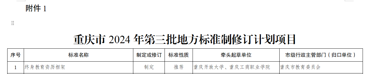 【供稿/终身教育处(学分银行管理中心)】《重庆终身教育资历框架》入选重庆市2024年第三批地方标准制订计划项目。