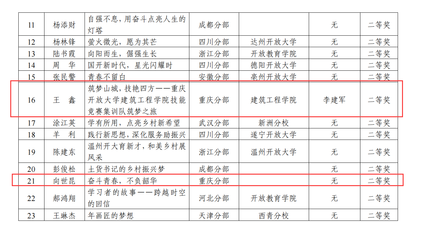 我校参评作品《创业学习两不误,终身学习记心中》荣获一等奖;《筑梦山城,技艳四方—重庆开放大学建筑工程学院技能竞赛集训队筑梦之旅》和《奋斗青春,不负韶华》荣获二等奖;《职场归来,重启学海之旅》荣获优秀奖。