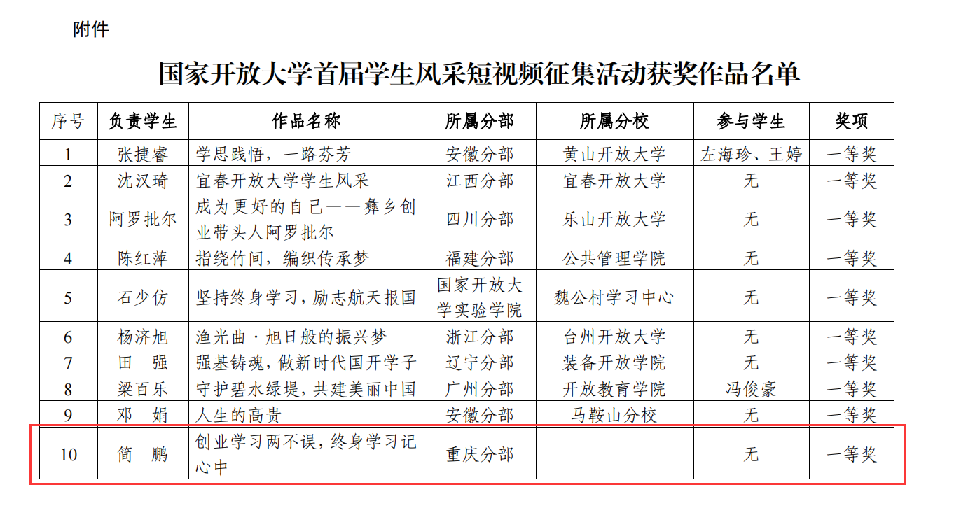 【供稿/远程教育处】近日,国家开放大学公布首届学生风采短视频征集活动获奖名单。